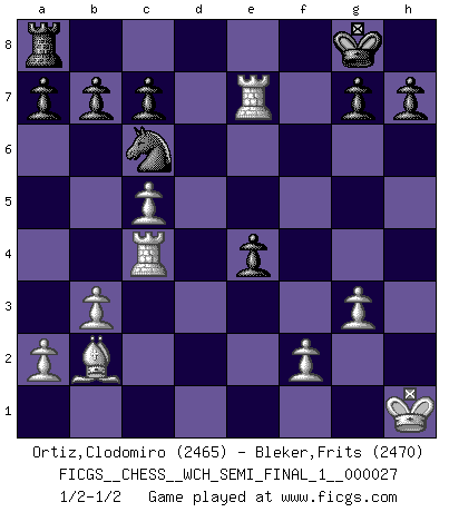 Last move : 1/2-1/2 2024 May 14 17:48:10 [Event "FICGS__CHESS__WCH_SEMI_FINAL_1__000027"] [Site "FICGS"] [Date "2024.04.28"] [Round "4"] [White "Ortiz,Clodomiro"] [Black "Bleker,Frits"] [Result "1/2-1/2"] [WhiteElo "2465"] [BlackElo "2470"] 1.c4 e5 2.Nc3 Nf6 3.g3 d5 4.cxd5 Nxd5 5.Bg2 Nb6 6.b3 Be7 7.Nf3 Nc6 8.O-O O-O 9.Bb2 Bg4 10.Rc1 Qd7 11.Ne4 Bh3 12.d4 Bxg2 13.Kxg2 Qg4 14.Nc5 e4 15.Nd2 Bxc5 16.dxc5 Nd5 17.Rc4 Rfe8 18.Nxe4 Nf4+ 19.Kh1 Qxe2 20.Qxe2 Nxe2 21.Re1 Nxg3+ 22.hxg3 f5 23.Rd1 fxe4 24.Rd7 Re7 25.Rxe7 1/2-1/2 Follow this game move after move (download)Pawns: they are the soul of this game, they alone form the attack and defense. (Philidor) Ich suche im Schach immer etwas Eigenes. Riskantes Spiel im Stile schachlicher Musketiere ist nicht meine Sache, auch wenn es vielen Freunden scharfer Wendungen gefällt. (Anatoly Karpov) Buenas posiciones no logran ganar juegos, buenas movidas sí. (Gerald Abrahams) Seul un grand joueur sait à quel point il joue faiblement. (Xavier Tartacover) We need strong personalities and only one world champion to attract sponsors. (Anatoly Karpov)