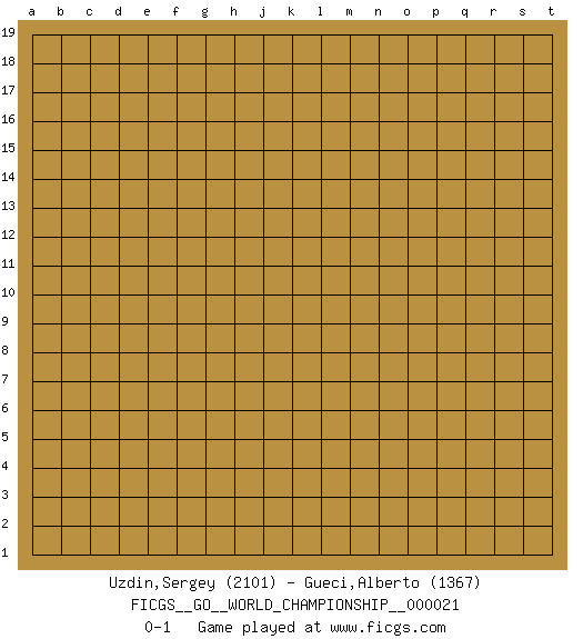 Last move : 0-1 2024 June 1 13:19:55 [Event "FICGS__GO__WORLD_CHAMPIONSHIP__000021"] [Site "FICGS"] [Date "2024.05.02"] [Round "1"] [Black "Uzdin,Sergey"] [White "Gueci,Alberto"] [Result "0-1"] [Rating 1 "2101"] [Rating 2 "1367"] 0-1 This go game has been lost on time (started : 2024.05.02 0:16:7) Follow this game move after move (download)Big groups never die. (Anonymous) See no evil, hear no evil, speak no evil. (The 3 monkeys)