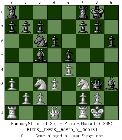 Last move : 0-1 2024 May 10 22:47:4 [Event "FICGS__CHESS__RAPID_D__000154"] [Site "FICGS"] [Date "2024.05.05"] [Round "1"] [White "Budnar,Milos"] [Black "Pintor,Manuel"] [Result "0-1"] [WhiteElo "1420"] [BlackElo "1835"] 1.e4 e5 2.Nf3 Nc6 3.Bb5 Bc5 4.O-O Qf6 5.d3 Nge7 6.Bg5 Qg6 7.h3 O-O 8.Bxc6 Nxc6 9.Bh4 d6 10.a3 Bxh3 11.Ng5 Bd7 12.Nc3 h6 13.Nf3 Bh3 14.Bg3 Qxg3 0-1 Follow this game move after move (download)I had a toothache during the first game. In the second game I had a headache. In the third game it was an attack of rheumatism. In the fourth game, I wasn't feeling well. And in the fifth game? Well, must one have to win every game ? (Siegbert Tarrasch) Ich könnte leicht behaupten: Ja,ja, Leonid Breschnew wollte nicht, daß ich Weltmeister werde. In der Tat war die Sache komplizierter. (Viktor Kortschnoi) Bobby solo arroja las piezas y solas caen en las casillas correctas. (Miguel Najdorf ) Des combinaisons [dans le jeu d'échecs] pareilles à des mélodies. Je crois entendre pour ainsi dire la musique des coups... (Vladimir Nabokov) There is a very easy way to return from a casino with a small fortune : go there with a large one. (Jack Yelton)