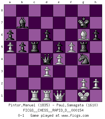 Last move : 0-1 2024 May 17 5:7:46 [Event "FICGS__CHESS__RAPID_D__000154"] [Site "FICGS"] [Date "2024.05.05"] [Round "1"] [White "Pintor,Manuel"] [Black "Paul,Samagata"] [Result "0-1"] [WhiteElo "1835"] [BlackElo "1610"] 1.e4 e5 2.f4 d6 3.Nf3 Nc6 4.Bc4 h6 5.O-O Nf6 6.d3 Be7 7.f5 a6 8.a4 Bd7 9.c3 O-O 10.Nh4 Kh7 11.Nf3 Na5 12.Ba2 c5 13.Nbd2 Qc7 14.Nc4 b5 15.Nxa5 Qxa5 16.Bb3 Qc7 17.a5 Rab8 18.Qe2 Bc6 19.Bc2 Rfe8 20.b4 cxb4 21.cxb4 Rbc8 22.Bb3 Kg8 23.Nh4 Bf8 24.Ng6 Bb7 25.Nxf8 Rxf8 26.Qf3 Qc3 27.Qg3 Kh7 28.Bxh6 gxh6 29.Bxf7 Rg8 30.Qh4 Rg5 31.Bg6+ Kg7 32.Rfd1 Qxb4 33.Qf2 Rc5 34.Rac1 Ng4 35.Qe1 Qd4+ 0-1 Follow this game move after move (download)Chess is life. (Bobby Fischer) Ich suche im Schach immer etwas Eigenes. Riskantes Spiel im Stile schachlicher Musketiere ist nicht meine Sache, auch wenn es vielen Freunden scharfer Wendungen gefällt. (Anatoly Karpov) ¿Que sería del Ajedrez sin errores graciosos?. (Kurt Richter) Shah mat. Le roi est mort. Cri de fierté d'un joueur venant de terrasser son adversaire, courtoisement, sans effusion de sang. A good book on your shelf is a friend that turns its back on you and remains a friend. (Author unknown)