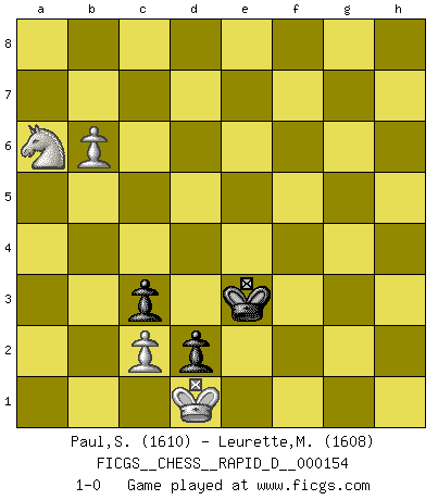 Last move : 1-0 2024 May 21 18:15:44 [Event "FICGS__CHESS__RAPID_D__000154"] [Site "FICGS"] [Date "2024.05.05"] [Round "1"] [White "Paul,Samagata"] [Black "Leurette,Marc-Antoine"] [Result "1-0"] [WhiteElo "1610"] [BlackElo "1608"] 1.d4 d5 2.h3 Nc6 3.Nf3 Nf6 4.Nc3 e6 5.a3 Be7 6.Bf4 O-O 7.e3 a6 8.Bd3 b5 9.O-O Na5 10.b4 Nc4 11.Bxc4 bxc4 12.Re1 Bd6 13.Bxd6 cxd6 14.e4 Bb7 15.e5 dxe5 16.Nxe5 Nd7 17.a4 Nxe5 18.Rxe5 Qd7 19.Qg4 f5 20.Qg5 Rae8 21.Rae1 Rf6 22.h4 h6 23.Qf4 Qe7 24.Rb1 Rg6 25.f3 Bc6 26.h5 Rg5 27.g4 Qf7 28.Kf2 Re7 29.Ke3 g6 30.hxg6 Rxg6 31.Rg1 Qf8 32.Rh1 fxg4 33.Qxf8+ Kxf8 34.fxg4 Bd7 35.b5 axb5 36.axb5 Bc8 37.Reh5 Rxg4 38.Rxh6 Rg3+ 39.Kd2 Rg2+ 40.Kc1 Reg7 41.Rh8+ Rg8 42.Rxg8+ Kxg8 43.Kb2 Kg7 44.Ra1 Kf6 45.b6 e5 46.dxe5+ Kxe5 47.Rd1 Bb7 48.Nb5 Rg6 49.Re1+ Kf5 50.Nd4+ Kf4 51.Re6 Rxe6 52.Nxe6+ Ke3 53.Kc3 Bc8 54.Nc7 Bb7 55.Ne8 Ba6 56.Nc7 d4+ 57.Kb2 c3+ 58.Kc1 d3 59.Nxa6 d2+ 60.Kd1 1-0 Follow this game move after move (download)Whoever sees no other aim in the game than that of giving checkmate to one's opponent will never become a good Chess player. (Euwe) Wenn ich Weiß habe gewinne ich weil ich Weiß habe, wenn ich Schwarz habe gewinne ich weil ich Bogoljubov bin. (Efim Bogoljubov) El Ajedrez es de 30 a 40 por ciento psicología. Uno no cuenta con esto cuando se juega contra una computadora. No lo puedo confundir. (Judith Polgar) Que feriez-vous si vous étiez en train de jouer aux échecs et que la fin du monde arrive ? Je continuerais à jouer. (Saint Borromée) Depression is just anger without enthusiasm. (Unknown)