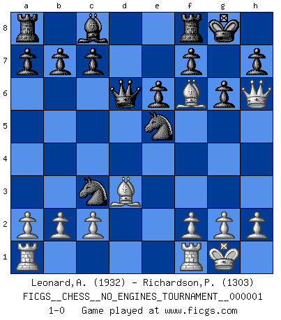 Last move : 1-0 2007 November 10 14:55:57 [Event "FICGS__CHESS__NO_ENGINES_TOURNAMENT__000001"] [Site "FICGS"] [Date "2007.09.15"] [Round "1"] [White "Leonard,Andrew"] [Black "Richardson,Patrick"] [Result "1-0"] [WhiteElo "1932"] [BlackElo "1303"] 1.e4 Nf6 2.e5 Nd5 3.Nf3 d6 4.Bc4 dxe5 5.Nxe5 e6 6.d4 Bd6 7.O-O Nd7 8.Qh5 Bxe5 9.dxe5 O-O 10.Bd3 g6 11.Qh6 Nxe5 12.Bg5 Qd6 13.Nc3 Nxc3 14.Bf6 1-0 Alekhine's defense Kingside Castling by player White (move 7) Kingside Castling by player Black (move 9) Player White won this chess game. Follow this game move after move (download)Chess holds its master in its own bonds, shackling the mind and brain so that the inner freedom of the very strongest must suffer. (Albert Einstein) Ein Isolani verdüstert die Stimmung auf dem ganzen Schachbrett. (Savielly Grigorievitsch Tartakower) No hay un Gran Maestro de Ajedrez que sea normal; solo se diferencían ellos por la magnitud de su locura. (Viktor Korchnoi) Le joueur d'Echecs qui veut atteindre le top est obligé de développer son propre credo créatif. Alexeï Stepanovicth Souétine. Il est facile d'écrire des livres ! Ce qui est difficile, c'est de jouer ! (Alexeï Stepanovicth Souétine) Life is pain my dear and anyone who says otherwise is selling something. (Princess Bride)