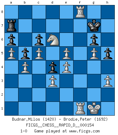 Last move : 1-0 2024 June 6 23:16:20 [Event "FICGS__CHESS__RAPID_D__000154"] [Site "FICGS"] [Date "2024.05.05"] [Round "1"] [White "Budnar,Milos"] [Black "Brodie,Peter"] [Result "1-0"] [WhiteElo "1420"] [BlackElo "1692"] 1.e4 e5 2.Nf3 Nc6 3.Bb5 Nd4 4.Nxd4 exd4 5.h3 Nf6 6.d3 Bd6 7.O-O O-O 8.Bg5 Be7 9.c4 c6 10.Ba4 Bd6 11.Nd2 Re8 12.Qf3 Be5 13.Bf4 d6 14.Bxe5 dxe5 15.c5 Bd7 16.Nc4 b5 17.Nd6 Re7 18.Bb3 Be6 19.Bxe6 fxe6 20.b4 Qf8 21.a4 a6 22.a5 Nh5 23.Qxh5 g6 24.Qxe5 Qg7 25.Qxg7 Rxg7 26.g4 h5 27.g5 Rf8 28.f4 e5 29.fxe5 Re7 30.Rf6 Kg7 31.Raf1 Ra7 32.Rxf8 1-0 Follow this game move after move (download)Nowadays, when you're not a grandmaster at 14, you can forget about it. (Anand Viswanathan) Das Schach ist nichts für kleine Geister, es beansprucht einen vollen Mann, der sich nicht sklavisch an das Überlieferte hält, sondern selbständig die Tiefen des Spiels zu ergründen sucht. (Wilhelm Steinitz) A la fecha, Fischer esta simplemente un nivel arriba de todos los mejores jugadores de Ajedrez del mundo. (John Jacobs) Les Echecs ont trois composantes : le temps, l'espace et le matériel en dernier. (Mikhail Tal) Everything in life is luck. (Donald Trump)