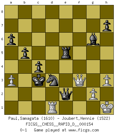 Last move : 0-1 2024 August 5 15:26:14 [Event "FICGS__CHESS__RAPID_D__000154"] [Site "FICGS"] [Date "2024.05.05"] [Round "1"] [White "Paul,Samagata"] [Black "Joubert,Hennie"] [Result "0-1"] [WhiteElo "1610"] [BlackElo "1522"] 1.d4 Nf6 2.Nc3 g6 3.e4 d6 4.h3 Bg7 5.Be3 O-O 6.Bd3 e5 7.Nf3 Nc6 8.a3 Re8 9.O-O exd4 10.Nxd4 Nxd4 11.Bxd4 b6 12.f3 Bb7 13.Bb5 Re7 14.Bd3 c5 15.Bf2 Rc8 16.Bh4 Qc7 17.Qd2 a6 18.Rab1 b5 19.Nd1 Qb6 20.Kh1 c4 21.Be2 Rd7 22.Nf2 d5 23.e5 Ne8 24.f4 Nc7 25.Bg4 Ne6 26.Rbe1 Re8 27.c3 Rc7 28.f5 Nc5 29.Bg5 Bxe5 30.Rxe5 Rxe5 31.Bf4 Nb3 32.Qc2 Rce7 33.Bxe5 Rxe5 34.fxg6 fxg6 35.Nd3 Re8 36.Nf4 d4 37.cxd4 Qxd4 38.Nxg6 Be4 39.Qe2 Bxg6 40.Be6+ Kg7 41.Re1 Nc5 42.Rd1 Rxe6 43.Qf3 Qe4 44.Qc3+ Kf7 45.Rf1+ Ke7 46.Qg7+ Kd6 47.Qf8+ Kd5 48.Qd8+ Rd6 49.Qg8+ Kd4 50.Qg7+ Qe5 51.Rd1+ Nd3 52.Qa7+ Ke4 53.Qb7+ Rd5 54.Rf1 Qxb2 55.Qe7+ Re5 56.Qh4+ Kd5 57.Qd8+ Ke4 58.Qh4+ Ke3 59.Qg3+ Kd2 60.Qf3 Kc3 61.Rd1 Qe2 0-1 Follow this game move after move (download)I play correspondence chess because it is both art and science while chess is art only. (A player at FICGS) Ich brauche nur einen Blick auf das Schachbrett zu werfen, und weiß schon, was in der Stellung steckt, was geschehen kann und was geschehen wird. Alle übrigen suchen und prüfen, ich aber weiß es! (José Raúl Capablanca) En manos de Fischer's, una diminuta ventaja teórica es tan buena como tener una Reina de ventaja. (Isaac Kashdan) Dans le domaine de la peinture, de la gravure et de la sculpture, dès la première décennie de notre siècle, les artistes abandonnent la représentation de la partie d'échecs pour se concentrer sur les pièces, sur les échiquiers et sur toutes les variations auxquelles les unes et les autres peuvent donner lieu. On passe en quelque sorte d'un thème social à un thème musical (au sens de la musica médiévale, c'est-à-dire d'une notion qui inclue le rythme, l'harmonie, la construction et la déconstruction, etc.). Graphiquement et picturalement, l'échiquier apparaît comme une structure ouverte, dynamique, d'une richesse infinie, autorisant toutes les combinatoires et débouchant sur des mouvements et des rythmes de nature exponentielle. (Michel Pastoureau) Mac users swear by their computers. PC users swear at their computers. (Author unknown)