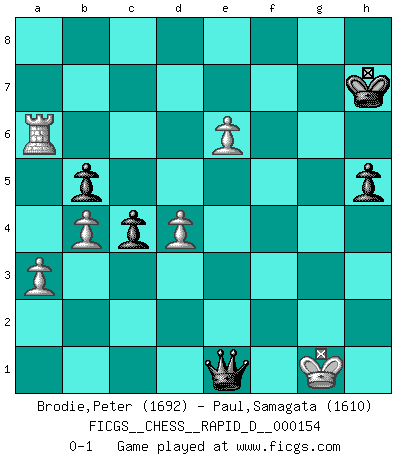 Last move : 0-1 2024 July 18 19:7:50 [Event "FICGS__CHESS__RAPID_D__000154"] [Site "FICGS"] [Date "2024.05.05"] [Round "1"] [White "Brodie,Peter"] [Black "Paul,Samagata"] [Result "0-1"] [WhiteElo "1692"] [BlackElo "1610"] 1.d4 d5 2.Nf3 Nc6 3.Bf4 a6 4.Nc3 Nf6 5.e3 Bf5 6.Bd3 Bxd3 7.cxd3 e6 8.O-O Be7 9.Ne5 Nxe5 10.dxe5 Nd7 11.d4 O-O 12.a3 c5 13.Ne2 c4 14.Nc3 Qc7 15.Nxd5 Qd8 16.Nc3 b5 17.b4 Nb6 18.Rb1 Nd5 19.Nxd5 Qxd5 20.Qg4 Kh8 21.Rbc1 Rac8 22.Rc3 f5 23.Qf3 Qxf3 24.gxf3 g5 25.Bg3 h5 26.h3 f4 27.exf4 gxf4 28.Bh2 Rf5 29.Kh1 Rg8 30.R3c1 Bg5 31.Rg1 Kh7 32.Rg2 Kh6 33.h4 Bxh4 34.Rxg8 Bxf2 35.Bg1 Be3 36.Bxe3 fxe3 37.Rcg1 Kh7 38.R1g7+ Kh6 39.Rg1 Kh7 40.R8g6 Rxf3 41.Rxe6 e2 42.Rxa6 Rf1 43.Ra7+ Kh6 44.Ra6+ Kh7 45.e6 Rxg1+ 46.Kxg1 e1Q+ 0-1 Follow this game move after move (download)Fischer is the strongest player in the world. In fact, the strongest player who ever lived. (Larry Evans) Schach ist Leben. (Robert James Fischer) Diferente gente reacciona diferentemente en aceptar la derrota. (Bobby Fischer) Les échecs sont plus proches de l'art de l'assassinat que de l'art de la guerre. (Arturo Perez-Reverte) Programming can only do so much before it becomes too much. (Don Groves)