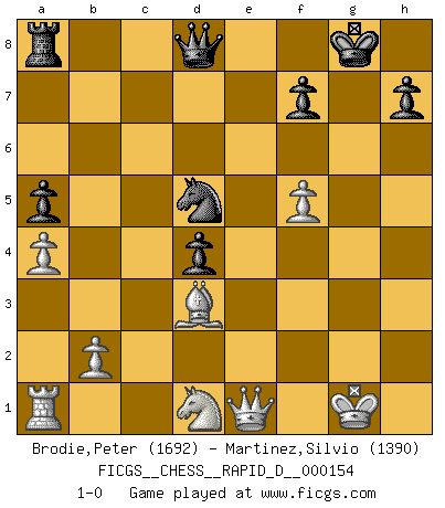 Last move : 1-0 2024 August 14 14:13:9 [Event "FICGS__CHESS__RAPID_D__000154"] [Site "FICGS"] [Date "2024.05.05"] [Round "1"] [White "Brodie,Peter"] [Black "Martinez,Silvio"] [Result "1-0"] [WhiteElo "1692"] [BlackElo "1390"] 1.e4 Nc6 2.Bc4 e6 3.Nf3 d5 4.exd5 exd5 5.Qe2+ Nge7 6.Bd3 g6 7.Bb5 a6 8.Ba4 Bd7 9.O-O Bg7 10.Nc3 b5 11.Bb3 Bg4 12.h3 Bh5 13.g4 b4 14.Nd1 Bxg4 15.hxg4 O-O 16.c3 bxc3 17.dxc3 Re8 18.Qd3 Na5 19.Bc2 c5 20.Qe2 Nac6 21.Bf4 d4 22.cxd4 cxd4 23.Bd3 a5 24.a4 Nd5 25.Qd2 Ne5 26.Nxe5 Bxe5 27.Bxe5 Rxe5 28.f4 Re6 29.f5 gxf5 30.gxf5 Re5 31.Re1 Rxe1+ 32.Qxe1 1-0 This chess game has been lost on time (started : 2024.05.05 0:53:52) Follow this game move after move (download)In Chess, as it is played by masters, chance is practically eliminated. (Emanuel Lasker) Aljechin war kein Nazi. Er war ein Opportunist. Ein schrecklicher Mann. Er liebte Geld über alles und würde für Geld ein Jude, ein Katolik oder ein Protestant werden. (Miguel Najdorf) El Ajedrez es 99 por ciento táctica. (Teichmann) Le succès, c'est être capable d'aller d'échec en échec sans perdre son enthousiasme. (Winston Churchill) Art is not a thing, it is a way. (Elbert Hubbard)