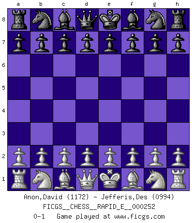 Last move : 0-1 2024 June 4 8:58:6 [Event "FICGS__CHESS__RAPID_E__000252"] [Site "FICGS"] [Date "2024.05.05"] [Round "1"] [White "Anon,David"] [Black "Jefferis,Des"] [Result "0-1"] [WhiteElo "1172"] [BlackElo "0994"] 0-1 This chess game has been lost on time (started : 2024.05.05 0:57:4) Follow this game move after move (download)Chess is played with the mind and not with the hands ! (Renaud and Kahn) Es gibt nur zwei wahre Schachgenies - das andere war Wilhelm Steinitz, der Weltmeister von 1872 bis 1894. (Robert James Fischer) El Ajedrez es el gimnasio de la mente. (Blaise Pascal) Si le désir cupide (et stupide) de gagner est une inépuisable source de souffrance, une combinaison brillante sur l'échiquier est une découverte : le coquelicot qui s'épanouit lorsque apparaît la Voie Lactée. (Arrabal) Industry executives and analysts often mistakenly talk about strategy as if it were some kind of chess match. But in chess, you have just two opponents, each with identical resources, and with luck playing a minimal role. The real world is much more like a poker game, with multiple players trying to make the best of whatever hand fortune has dealt them. In our industry, Bill Gates owns the table until someone proves otherwise. (David Moschella, 'Computerworld')