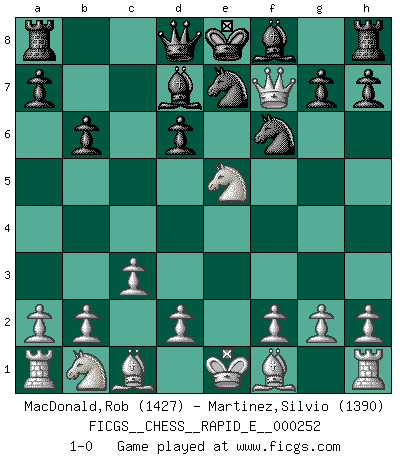 Last move : 1-0 2024 May 15 2:13:49 [Event "FICGS__CHESS__RAPID_E__000252"] [Site "FICGS"] [Date "2024.05.05"] [Round "1"] [White "MacDonald,Rob"] [Black "Martinez,Silvio"] [Result "1-0"] [WhiteElo "1427"] [BlackElo "1390"] 1.e4 Nc6 2.Nf3 e5 3.c3 d5 4.Qa4 Bd7 5.exd5 Nce7 6.Qb3 b6 7.Nxe5 Nf6 8.d6 cxd6 9.Qxf7+ 1-0 Follow this game move after move (download)When you absolutely don't know what to do anymore, it is time to panic. (John van der Wiel) Man wirke der falschen Auffassung entgegen, als ob jeder Zug Unmittelbares zu leisten habe; auch Werte- und Ruhezüge haben ihre Existenzberechtigung. (Aaron Nimzowitsch) En el Ajedrez, cuando menos, el valiente hereda la tierra. (Edmar Mednis) Un footballeur joue avec ses pieds, parfois avec sa tête. Un joueur d'échecs ne joue qu'avec sa tête. Et quand il ne joue plus, il meurt. (Jacob Murray) Kids, you tried your best and you failed miserably. The lesson is, never try. (Simpsons)