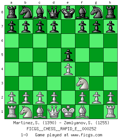Last move : 1-0 2024 June 6 2:13:59 [Event "FICGS__CHESS__RAPID_E__000252"] [Site "FICGS"] [Date "2024.05.05"] [Round "1"] [White "Martinez,Silvio"] [Black "Zemlyanov,Sergey"] [Result "1-0"] [WhiteElo "1390"] [BlackElo "1255"] 1.e4 e5 2.Nf3 1-0 This chess game has been lost on time (started : 2024.05.05 0:57:4) Follow this game move after move (download)Spassky will not be psyched out by Fischer. (Mike Goodall) Ein Springer auf f6 gegen die eigene Rochadestellung ist schlimmer als ein rostiger Nagel im Knie. (Efim Bogoljubov) El juego de Fischer siempre fue nítido, racional y brillante. Uno de los mejores por siempre. (Dave Regis) Les échecs, c'est l'imagination. (David Bronstein) After growing wildly for years, the field of computing appears to be reaching its infancy. (John Pierce)