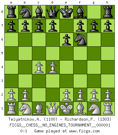 Last move : 0-1 2007 October 26 2:19:20 [Event "FICGS__CHESS__NO_ENGINES_TOURNAMENT__000001"] [Site "FICGS"] [Date "2007.09.15"] [Round "1"] [White "Telyatnikov,Anatoly"] [Black "Richardson,Patrick"] [Result "0-1"] [WhiteElo "1100"] [BlackElo "1303"] 1.d4 Nf6 2.c4 e6 0-1 This chess game has been lost on time (started : 2007.09.15 22:11:45) Queen's pawn game Player Black won this chess game. Follow this game move after move (download)I had a toothache during the first game. In the second game I had a headache. In the third game it was an attack of rheumatism. In the fourth game, I wasn't feeling well. And in the fifth game? Well, must one have to win every game ? (Siegbert Tarrasch) Kein Großmeister ist normal. Sie unterscheiden sich nur im Ausmaß Ihrer Verrücktheit. (Viktor Kortschnoi) Un sacrificio se refuta mucho mejor al aceptarlo. (Wilhelm Steinitz) Les écrivains ont utilisé les échecs pour analyser les côtés extrêmes de la nature humaine. Dans ce cadre, les échecs offrent un champ d'expérimentation idéal. Mais on pourrait faire la même chose avec la peinture. Et là, en vous référant à Van Gogh, vous ne tirerez pas de conclusion définitive sur les peintres. (Gary Kasparov) Chess, like love, like music, has the power to make people happy. (Siegbert Tarrasch)