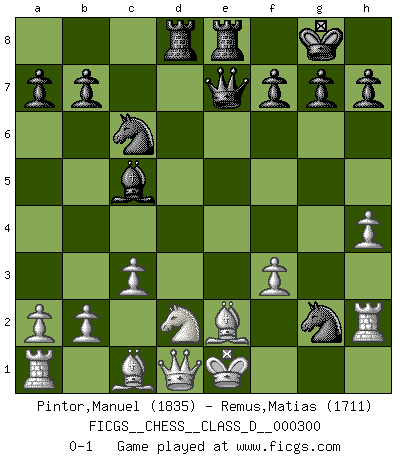 Last move : 0-1 2024 June 4 18:11:27 [Event "FICGS__CHESS__CLASS_D__000300"] [Site "FICGS"] [Date "2024.05.05"] [Round "1"] [White "Pintor,Manuel"] [Black "Remus,Matias"] [Result "0-1"] [WhiteElo "1835"] [BlackElo "1711"] 1.e4 e5 2.f4 d5 3.exd5 c6 4.dxc6 Nxc6 5.Nf3 e4 6.Ng5 Nf6 7.Bc4 Bc5 8.c3 O-O 9.d4 exd3 10.Bxd3 Re8+ 11.Be2 Bg4 12.Nf3 Qe7 13.Nbd2 Rad8 14.h3 Bxf3 15.gxf3 Nh5 16.h4 Nxf4 17.Rh2 Ng2+ 0-1 Follow this game move after move (download)I prefer to lose a really good game than to win a bad one. (David Levy) Charakterschwächen offenbaren sich normalerweise während einer Schachpartie. (Garry Kasparov) Aún el Rey más flojo huye despavorido ante la amenaza de un Jaque doble. (Aaron Nimzowitsch) Mon pion favori sur ma case favorite ! Bronstein en parlant d'un coup de pion en h5 quand il avait les Noirs. Beep ! (R2D2 in Star Wars ep.3)