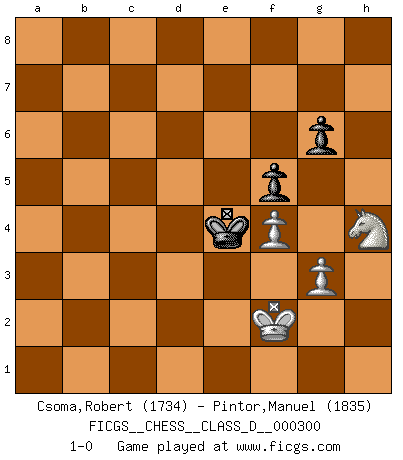 Last move : 1-0 2024 June 23 18:24:55 [Event "FICGS__CHESS__CLASS_D__000300"] [Site "FICGS"] [Date "2024.05.05"] [Round "1"] [White "Csoma,Robert"] [Black "Pintor,Manuel"] [Result "1-0"] [WhiteElo "1734"] [BlackElo "1835"] 1.e4 e5 2.Nf3 Nc6 3.d4 exd4 4.Nxd4 Qf6 5.c3 Bc5 6.Be3 Nxd4 7.Bxd4 Bxd4 8.cxd4 d6 9.Bc4 Qg6 10.O-O Nf6 11.e5 d5 12.Bd3 Bf5 13.Bxf5 Qxf5 14.exf6 Qxf6 15.Nc3 c6 16.Re1+ Kd7 17.Qg4+ Kc7 18.Re5 h5 19.Qe2 Rad8 20.b4 a6 21.a4 Rd7 22.b5 axb5 23.axb5 Kd6 24.bxc6 bxc6 25.Ra6 Rb7 26.Rxd5+ Kc7 27.Qe5+ Qxe5 28.Rxe5 Rd8 29.Re7+ Rd7 30.Rxd7+ Kxd7 31.g3 Rb3 32.Ne2 Rb2 33.Nf4 g6 34.Ra7+ Ke8 35.d5 cxd5 36.Nxd5 Kf8 37.Nf4 Kg7 38.Nd3 Rb1+ 39.Kg2 Rb5 40.Re7 Kf6 41.Rd7 Ke6 42.Rd8 Kf5 43.Rd7 f6 44.Nf4 h4 45.Rd5+ Rxd5 46.Nxd5 hxg3 47.hxg3 Ke5 48.Ne3 f5 49.f4+ Ke4 50.Kf2 Kd4 51.Ng2 Ke4 52.Nh4 1-0 Follow this game move after move (download)Chess is 99 percent tactics. (Teichmann) Es war undenkbar für die Behörden, dass ein sowjetischer Großmeister auf diese Art und Weise [Fischer-Taimanov 6:0] verliert, ohne dass es eine politischer Erklärung dafür gäbe. (Mark Taimanov) La batalla por la última verdad nunca sera ganada. Y es por eso que el Ajedrez es tan fascinante. (Hans Kmoch) Avec des compensations pour le matériel en plus... (Anonyme) If you don't practice you don't deserve to win. (Andre Agassi)