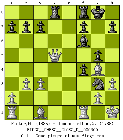 Last move : 0-1 2024 June 3 3:10:36 [Event "FICGS__CHESS__CLASS_D__000300"] [Site "FICGS"] [Date "2024.05.05"] [Round "1"] [White "Pintor,Manuel"] [Black "Jimenez Alban,Xavier Miguel"] [Result "0-1"] [WhiteElo "1835"] [BlackElo "1788"] 1.e4 e5 2.f4 exf4 3.Nf3 Nf6 4.Nc3 d5 5.exd5 Nxd5 6.Nxd5 Qxd5 7.d4 Be7 8.c3 Nc6 9.Be2 g5 10.O-O O-O 11.h3 Bf5 12.Nh2 Rad8 13.b3 Bf6 14.Ng4 Bxg4 15.Bxg4 Nxd4 16.Kh1 Nf5 17.Qxd5 Ng3+ 0-1 Follow this game move after move (download)I look one move ahead... the best ! (Siegbert Tarrasch) Sicherlich können nur Meister einen Stil haben. Daß ein nicht-Meister auch nur ein einziges Mal in seinem Leben eine Partie folgerecht durchführte, habe ich niemals bemerkt. (Emanuel Lasker) De todos mis libros Rusos, la defensa contiene y difunde el 'calor' mas grande que pudiese verse extraño al observar lo supremamente abstracto que el Ajedrez supuestamente es. (Vladimir Nabokov) Aidez vos pièces, elles vous aideront. (Paul Morphy) Perfection is achieved, not when there is nothing more to add, but when there is nothing left to take away. (Antoine de Saint-Exupéry)