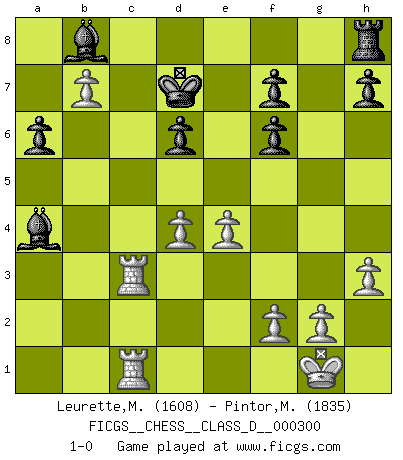 Last move : 1-0 2024 May 21 21:50:23 [Event "FICGS__CHESS__CLASS_D__000300"] [Site "FICGS"] [Date "2024.05.05"] [Round "1"] [White "Leurette,Marc-Antoine"] [Black "Pintor,Manuel"] [Result "1-0"] [WhiteElo "1608"] [BlackElo "1835"] 1.e4 e5 2.Nf3 Nc6 3.Bc4 Bc5 4.c3 Qf6 5.b4 Bb6 6.a4 a6 7.a5 Ba7 8.O-O d6 9.d3 Bg4 10.Nbd2 Qg6 11.Nh4 Qh5 12.Ndf3 Nf6 13.Bg5 O-O-O 14.Bxf6 gxf6 15.Bd5 Ne7 16.c4 c6 17.Bxc6 Nxc6 18.b5 axb5 19.cxb5 Nd4 20.b6 Bb8 21.Rc1+ Kd7 22.h3 Nxf3+ 23.Nxf3 Be6 24.d4 Ke7 25.a6 bxa6 26.Nxe5 Qxd1 27.Nc6+ Ke8 28.Rfxd1 Bb3 29.Rd3 Ba4 30.Nxd8 Kxd8 31.b7 Kd7 32.Rdc3 1-0 Follow this game move after move (download)Before the endgame, the Gods have placed the middle game. (Siegbert Tarrasch) Ich verstehe mehr vom Schach als irgendein anderer lebender Meister. (José Raúl Capablanca) El Ajedrez demanda una total concentración. (Bobby Fischer) Le jeu d'échecs est comme rejeté hors du temps. (Antoine de Saint-Exupéry) The general who wins the battle makes many calculations in his temple before the battle is fought. The general who loses makes but few calculations beforehand. (Sun Tzu)