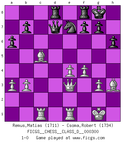 Last move : 1-0 2024 June 21 20:54:24 [Event "FICGS__CHESS__CLASS_D__000300"] [Site "FICGS"] [Date "2024.05.05"] [Round "1"] [White "Remus,Matias"] [Black "Csoma,Robert"] [Result "1-0"] [WhiteElo "1711"] [BlackElo "1734"] 1.d4 d6 2.Nf3 c6 3.c4 Qc7 4.g3 e5 5.Nc3 Nf6 6.Qc2 Be7 7.Bg2 h6 8.O-O Be6 9.b3 Na6 10.a3 O-O 11.Bb2 Rae8 12.Rac1 Nb8 13.e4 a6 14.c5 exd4 15.cxd6 Bxd6 16.Nxd4 Bd7 17.Rfd1 c5 18.Nde2 Nc6 19.Qd2 Be5 20.f4 Bxc3 21.Nxc3 Bg4 22.Re1 Nd4 23.Nd5 Nxd5 24.Bxd4 Ne7 25.Bxc5 Rd8 26.Qe3 Qd7 27.h3 Bxh3 28.Bxh3 1-0 Follow this game move after move (download)In a gambit you give up a Pawn for the sake of getting a lost game. (Samuel Standige Boden) Ich trinke, ich rauche, ich spiele, ich liebe Frauen aber Fernschach ist ein Laster, das ich nicht habe. (Mikhail Nekhemyevich Tal) El Ajedrez es una manera fabulosa para que los niños aprendan a autovalorarse y a autoestimarse. (Saudin Robovic) Des points faibles ou des trous dans la position de l'adversaire doivent être occupés par des pièces et non pas par des pions. (Siegbert Tarrasch) Vladimir Ras-Putin is still alive... He is also a good actor, I saw him in the Lord of the Rings. (Rodolfo d'Ettorre)