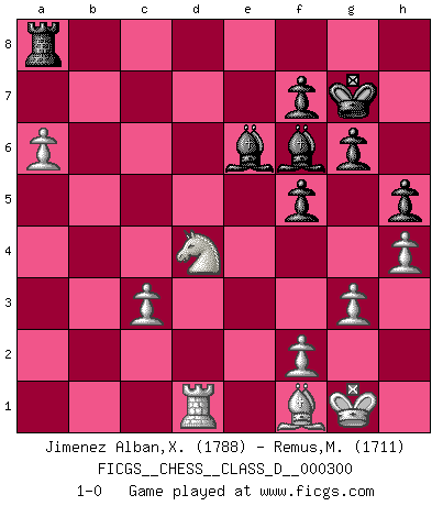 Last move : 1-0 2024 October 24 19:35:24 [Event "FICGS__CHESS__CLASS_D__000300"] [Site "FICGS"] [Date "2024.05.05"] [Round "1"] [White "Jimenez Alban,Xavier Miguel"] [Black "Remus,Matias"] [Result "1-0"] [WhiteElo "1788"] [BlackElo "1711"] 1.d4 d5 2.Nf3 Nf6 3.Bf4 c5 4.e3 Nc6 5.Nbd2 Nh5 6.dxc5 Nxf4 7.exf4 e6 8.Nb3 g6 9.c3 Bg7 10.h4 h5 11.Bb5 Bd7 12.O-O Qc7 13.Re1 O-O 14.f5 exf5 15.Qxd5 Rfd8 16.Qd6 Qxd6 17.cxd6 a6 18.Bf1 Bf8 19.Rad1 Be6 20.Nc5 Bxa2 21.Nxb7 Rd7 22.Nc5 Rxd6 23.Rxd6 Bxd6 24.Nxa6 Be6 25.b4 Kg7 26.b5 Nb8 27.Rd1 Nxa6 28.bxa6 Be7 29.g3 Bf6 30.Nd4 1-0 Follow this game move after move (download)When I have White, I win because I am white; When I have Black, I win because I am Bogolyubov. (Bogolyubov) Die Auseinandersetzung mit Karpow war politisch geprägt. Er stand für das kommunistische System, wurde von dessen Repräsentanten gehätschelt. Ich war der Oppositionelle. Jeder Schachweltmeister spiegelt auch die gesellschaftlichen Verhältnisse wider. Kramnik steht für die Börsen-Generation des Neuen Markts, ideologiefrei, zahlenfixiert. (Garry Kasparov) En el Ajedrez, cuando menos, el valiente hereda la tierra. (Edmar Mednis) Les Echecs sont et restent toujours un combat, un combat intégral comme la boxe, la lutte ou un autre sport, et où il doit y avoir un vainqueur et un vaincu. (Joseph Emil Diemer) Drag your thoughts away from your troubles... by the ears, by the heels, or any other way you can manage it. (Mark Twain)