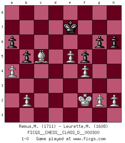Last move : 1-0 2024 June 27 16:30:6 [Event "FICGS__CHESS__CLASS_D__000300"] [Site "FICGS"] [Date "2024.05.05"] [Round "1"] [White "Remus,Matias"] [Black "Leurette,Marc-Antoine"] [Result "1-0"] [WhiteElo "1711"] [BlackElo "1608"] 1.c4 e5 2.Nc3 Nf6 3.Nf3 Nc6 4.e3 d5 5.cxd5 Nxd5 6.Bb5 Bd6 7.Nxd5 Bd7 8.Nc3 a6 9.Be2 O-O 10.d4 exd4 11.Nxd4 Re8 12.O-O Nxd4 13.Qxd4 Be5 14.Qd3 Re6 15.f4 Rd6 16.Qc2 Bxc3 17.Qxc3 Bc6 18.Bf3 Bxf3 19.Rxf3 Rc6 20.Qb3 Rb6 21.Qc2 Rc6 22.Qe2 Qf6 23.Rf1 Re8 24.Rd1 h6 25.e4 Qe7 26.Rd4 f5 27.e5 Qc5 28.Be3 Qc2 29.Rd2 Qe4 30.Qd3 Qxd3 31.Rxd3 Kf7 32.Rc1 Rxc1+ 33.Bxc1 g6 34.Rd7+ Re7 35.Rxe7+ Kxe7 36.Kf2 c5 37.Be3 b6 38.a4 b5 39.Bxc5+ 1-0 Follow this game move after move (download)A big shock; the best chess player in history has passed away. (Lajos Portisch, about Bobby Fischer's death) Karpov ist ein Museumsstück. (Garry Kasparov) Una clavada es mas poderosa que una espada. (Fred Reinfeld) Les échecs, c'est la lutte contre l'erreur. (Johannes Zukertort) The Movers & Shakers of this world are those who play chess in the mornings and go to the disco in the evenings. (Dinesh De Silva)