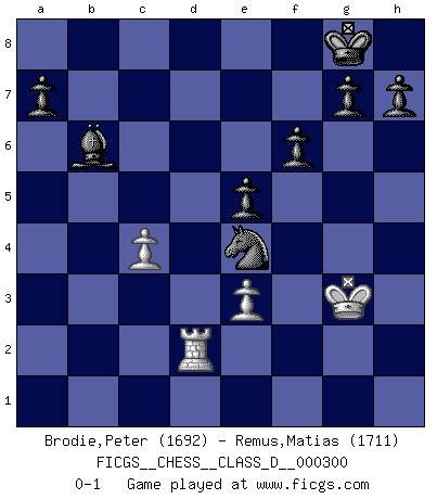 Last move : 0-1 2024 October 11 19:41:32 [Event "FICGS__CHESS__CLASS_D__000300"] [Site "FICGS"] [Date "2024.05.05"] [Round "1"] [White "Brodie,Peter"] [Black "Remus,Matias"] [Result "0-1"] [WhiteElo "1692"] [BlackElo "1711"] 1.c4 c5 2.Nc3 Nf6 3.g3 d5 4.d3 d4 5.Ne4 Nxe4 6.dxe4 e5 7.e3 Nc6 8.Nf3 Be7 9.Bd3 O-O 10.O-O f6 11.h3 Be6 12.a3 Bxh3 13.Re1 Qd7 14.Bf1 Bg4 15.Be2 Be6 16.Bd3 Rfd8 17.g4 Bxg4 18.Be2 Qe8 19.Bd3 Qh5 20.Be2 d3 21.Qb3 dxe2 22.Nh2 Rd1 23.Bd2 Rxd2 24.Qxb7 Rc8 25.Nxg4 Qxg4+ 26.Kh2 Qe6 27.b3 Qd7 28.Qxd7 Rxd7 29.Rxe2 Rcd8 30.R2e1 Rd2 31.Kg2 R8d3 32.b4 cxb4 33.axb4 Bxb4 34.Ra6 Rd6 35.Rc1 Bc5 36.Kg3 Nb4 37.Rxd6 Rxd6 38.Ra1 Rd2 39.Ra5 Bb6 40.Rb5 Nd3 41.Rd5 Nxf2 42.Rxd2 Nxe4+ 0-1 Follow this game move after move (download)When you don't know what to play, wait for an idea to come into your opponent's mind. You may be sure that idea will be wrong. (Siegbert Tarrasch) Der Verteidiger gebe der Gewalt nach, aber nur der Gewalt. Er schaffe sich nicht freiwillig, etwa aus Blindheit oder aus Schrecken, irgendwelche Schwächen. Er lasse sich nicht bluffen. (Emanuel Lasker) El Ajedrez es el gimnasio de la mente. (Blaise Pascal) La vie et les Echecs sont tous les deux une lutte constante. (Lasker) Creativity is allowing yourself to make mistakes. Art is knowing which ones to keep. (Scott Adams)