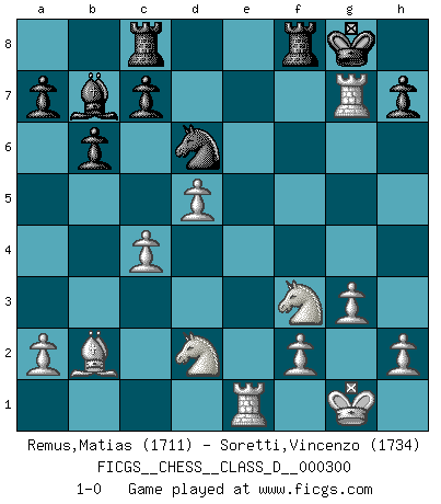 Last move : 1-0 2024 June 15 11:51:9 [Event "FICGS__CHESS__CLASS_D__000300"] [Site "FICGS"] [Date "2024.05.05"] [Round "1"] [White "Remus,Matias"] [Black "Soretti,Vincenzo"] [Result "1-0"] [WhiteElo "1711"] [BlackElo "1734"] 1.d4 Nf6 2.c4 e6 3.Nf3 Be7 4.g3 O-O 5.Bg2 d5 6.O-O Nc6 7.b3 dxc4 8.bxc4 Ne8 9.Bb2 Nd6 10.Nbd2 f6 11.e4 Nf7 12.Qe2 b6 13.Rfd1 Bb7 14.Bh3 f5 15.exf5 exf5 16.d5 Nb8 17.Bxf5 Nd7 18.Re1 Re8 19.Be6 Rf8 20.Bxd7 Qxd7 21.Qxe7 Qxe7 22.Rxe7 Rac8 23.Rae1 Nd6 24.Rxg7+ 1-0 Follow this game move after move (download)During a Chess competition a Chessmaster should be a combination of a beast of prey and a monk. (Alexander Alekhine) Offensichtlich kennt Kasparow nichts anderes als Schach, und ich könnte 500 weitere Spieler dieser Sorte benennen. (Judith Polgar) El Ajedrez detiene a su maestro dentro de sus propios vínculos, encadenando la mente y el cerebro, por lo que la libertad interior del mas fuerte debe sufrir. (Albert Einstein) Ce qui caractérise les parties de combat, c'est que si le défenseur a constamment de difficiles problèmes à résoudre, l'attaquant doit chercher sans relâche de nouvelles possibilités d'attaque. (Koblentz) History is a gallery of pictures in which there are few originals and many copies. (Alexis de Tocqueville)