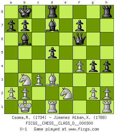 Last move : 0-1 2024 September 3 16:30:18 [Event "FICGS__CHESS__CLASS_D__000300"] [Site "FICGS"] [Date "2024.05.05"] [Round "1"] [White "Csoma,Robert"] [Black "Jimenez Alban,Xavier Miguel"] [Result "0-1"] [WhiteElo "1734"] [BlackElo "1788"] 1.e4 e5 2.Nf3 Nc6 3.d4 exd4 4.Nxd4 Nf6 5.Bg5 h6 6.Bxf6 Qxf6 7.c3 Bc5 8.Nf3 g5 9.Qd5 Bb6 10.e5 Qe7 11.Nbd2 g4 12.Nd4 Nxe5 13.Be2 c6 14.Qe4 d5 15.Qe3 c5 16.N4b3 Bd7 17.O-O-O c4 18.Nd4 O-O-O 19.f4 Nd3+ 20.Qxd3 cxd3 21.Bxd3 Qf6 22.Ne2 h5 23.Nb3 Kb8 24.Kb1 h4 0-1 Follow this game move after move (download)Your body has to be in top condition. Your Chess deteriorates as your body does. You can't separate body from mind. (Bobby Fischer) Ich las kürzlich ein Buch von Nietzsche. Er sagte Religion verdumme nur die Menschen. Ich stimme zu. (Robert James Fischer) Cuando le juegas a Fischer, no es una cuestion de si vas a ganar o perder. Es una cuestion de si vas a sobrevivir. (Boris Spassky) Les Cavaliers se révèlent fort utiles dans les positions fermées. D'habitude, les Fous sont un peu plus forts que les Cavaliers dans les positions ouvertes. Qu'on le veuille ou non, il restera toujours des exceptions ! I feel so... helpless. (C-3PO in Star Wars ep.3)