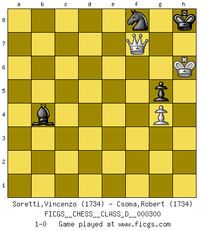 Last move : 1-0 2024 July 22 22:9:26 [Event "FICGS__CHESS__CLASS_D__000300"] [Site "FICGS"] [Date "2024.05.05"] [Round "1"] [White "Soretti,Vincenzo"] [Black "Csoma,Robert"] [Result "1-0"] [WhiteElo "1734"] [BlackElo "1734"] 1.e4 d6 2.d4 Nf6 3.Nc3 g6 4.Nf3 Bg7 5.Rb1 O-O 6.Bc4 Bg4 7.O-O c6 8.Be3 e6 9.h3 Bxf3 10.Qxf3 Nbd7 11.Rfd1 Qc7 12.a3 b5 13.Bd3 a5 14.b4 axb4 15.axb4 Ra3 16.Ne2 Rfa8 17.Bc1 R3a4 18.Bd2 e5 19.c3 Ra2 20.Nc1 Ra1 21.Nb3 Rxb1 22.Rxb1 Nb6 23.Na5 Nbd7 24.d5 cxd5 25.exd5 Nb6 26.Bxb5 Nbxd5 27.Bc6 Rxa5 28.bxa5 Qxc6 29.Rb6 Qc7 30.Rb5 e4 31.Qd1 Nxc3 32.Bxc3 Qxc3 33.Rb8+ Bf8 34.a6 Qc7 35.Qb1 Kg7 36.Rb7 Qc6 37.a7 Qa4 38.Rxf7+ Kxf7 39.Qb7+ Ke6 40.a8Q Qxa8 41.Qxa8 Be7 42.Qc6 Kf7 43.Kf1 d5 44.Ke2 h6 45.Ke3 g5 46.f3 exf3 47.Kxf3 h5 48.g4 hxg4+ 49.hxg4 Bf8 50.Qc7+ Be7 51.Qe5 Nh7 52.Qxd5+ Kg7 53.Qd7 Kf8 54.Qf5+ Kg7 55.Ke4 Bf6 56.Kd5 Be7 57.Ke6 Ba3 58.Qf7+ Kh8 59.Kf5 Bb4 60.Kg6 Nf8+ 61.Kh6 1-0 Follow this game move after move (download)Every Pawn is a potential Queen. (James Mason) Zu meiner Zeit war ein 20 jähriger ein junger Spieler, heute ist er ein Veteran. (Garry Kasparov) Solo puedes ser bueno en el Ajedrez si amas al juego. (Bobby Fischer) Les échecs sont plus proches de l'art de l'assassinat que de l'art de la guerre. (Arturo Perez-Reverte) For to win one hundred victories in one hundred battles is not the acme of skill. To subdue the enemy without fighting is the acme of skill. (Sun Tzu)