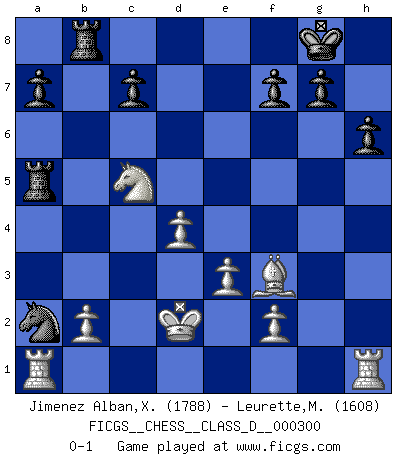 Last move : 0-1 2024 September 14 9:22:17 [Event "FICGS__CHESS__CLASS_D__000300"] [Site "FICGS"] [Date "2024.05.05"] [Round "1"] [White "Jimenez Alban,Xavier Miguel"] [Black "Leurette,Marc-Antoine"] [Result "0-1"] [WhiteElo "1788"] [BlackElo "1608"] 1.d4 d5 2.Nf3 Nc6 3.Bf4 Bg4 4.e3 Nf6 5.h3 Bxf3 6.Qxf3 e6 7.c3 Bd6 8.Nd2 O-O 9.Bg5 Be7 10.h4 h6 11.g4 e5 12.Bxf6 Bxf6 13.g5 Bxg5 14.hxg5 Qxg5 15.Qxd5 Rad8 16.Qg2 Qxg2 17.Bxg2 exd4 18.cxd4 Rd6 19.Rc1 Rc8 20.Ne4 Rg6 21.Bf3 Nb4 22.Ke2 Nxa2 23.Ra1 Ra6 24.Nc5 Ra5 25.Nxb7 Ra6 26.Nc5 Ra5 27.Nb7 Ra6 28.Nc5 Ra5 29.Kd2 Rb8 0-1 This chess game has been lost on time (started : 2024.05.05 15:3:16) Follow this game move after move (download)Chess teaches you to control the initial excitement you feel when you see something that looks good and it trains you to think objectively when you're in trouble. (Stanley Kubrick) Als er Schachweltmeister wurde ließ er praktisch alle stärksten Sovietspieler für sich arbeiten. Wenn ein auch nur mittelmässiger Meister ein Spezialist für eine bestimmte Eröffnung war, wurde er von Karpov gerufen. Das wurde alles geheim gehalten. (Mikhail Moiseyevich Botvinik) Las combinaciones han sido siempre el aspecto más intrigante del Ajedrez. Los Maestros las buscan, el público las aplauden, los críticos las alaban. La razón se debe a que las combinaciones hacen posible que el Ajedrez sea más que un ejercicio matemático con una carencia de vida. Ellas son la poesía del juego, son del Ajedrez lo que la melodía es de la música. Ellas representan el triunfo de la mente sobre la materia. (Reuben Fine) La menace est plus forte que l'exécution. (Aaron Nimzovitch) I know the human being and fish can coexist peacefully. (George W. Bush, Saginaw sept. 29, 2000)