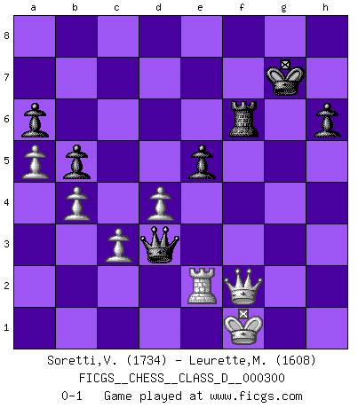 Last move : 0-1 2024 June 17 14:56:56 [Event "FICGS__CHESS__CLASS_D__000300"] [Site "FICGS"] [Date "2024.05.05"] [Round "1"] [White "Soretti,Vincenzo"] [Black "Leurette,Marc-Antoine"] [Result "0-1"] [WhiteElo "1734"] [BlackElo "1608"] 1.e4 e5 2.Nf3 Nc6 3.Bb5 Bc5 4.O-O Nf6 5.d3 Nd4 6.Nxd4 Bxd4 7.c3 Bb6 8.Qe2 c6 9.Ba4 O-O 10.Be3 Bxe3 11.Qxe3 b5 12.Bc2 d5 13.Nd2 Qd6 14.f3 c5 15.exd5 Nxd5 16.Qf2 Nb6 17.Ne4 Qg6 18.Ng3 Qf6 19.Ne4 Qg6 20.Nxc5 Qd6 21.b3 Nd7 22.Ne4 Qc6 23.b4 a6 24.Qd2 Bb7 25.a4 Nf6 26.Nc5 Nd7 27.Nxb7 Qxb7 28.a5 Nf6 29.Rae1 Rae8 30.Re2 Qc7 31.Bb3 h6 32.g4 g5 33.h4 Nh7 34.hxg5 Nxg5 35.Kg2 Kg7 36.Rfe1 Qc6 37.Re3 f5 38.gxf5 Rxf5 39.Bd1 Re6 40.d4 Rg6 41.Kf1 Nxf3 42.Bxf3 Rxf3+ 43.Rxf3 Qxf3+ 44.Qf2 Qd3+ 45.Re2 Rf6 0-1 Follow this game move after move (download)Look at Garry Kasparov. After he loses, invariably he wins the next game. He just kills the next guy. That's something that we have to learn to be able to do. (Maurice Ashley) Wenn Du absolut nicht mehr weißt, was Du tun sollst, dann ist es Zeit für Panik. (John van der Wiel) Hoy en día, si tu no eres un Gran Maestro a los 14 años, es mejor que lo olvides. (Anand Viswanathan) Horreur, mais aussi harmonie suprême : qu'y avait-il en effet au monde en dehors des échecs ? Le brouillard, l'inconnu, le non-être... (Vladimir Nabokov) Perception is reality. (Immanuel Kant)