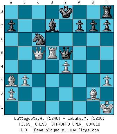 Last move : 1-0 2024 July 26 1:29:41 [Event "FICGS__CHESS__STANDARD_OPEN__000018"] [Site "FICGS"] [Date "2024.05.19"] [Round "1"] [White "Duttagupta,Aniruddha"] [Black "LaDuke,Matt"] [Result "1-0"] [WhiteElo "2248"] [BlackElo "2230"] 1.Nf3 Nf6 2.b3 d5 3.Bb2 Bf5 4.g3 c5 5.Bg2 Nc6 6.d3 Qc7 7.O-O Rd8 8.Qe1 e5 9.e4 dxe4 10.dxe4 Bg4 11.Na3 Nd4 12.Nxd4 cxd4 13.h3 Bd7 14.f4 b6 15.fxe5 Bxa3 16.Bxa3 Qxe5 17.Rd1 Be6 18.Qb4 Rd7 19.Rf3 Nh5 20.c3 Nxg3 21.cxd4 Ne2+ 22.Kh1 Nxd4 23.Rfd3 Nc6 24.Qa4 b5 25.Qa6 Qc7 26.Qxb5 Rxd3 27.Rxd3 Bd7 28.Qc5 Qe5 29.Rd5 1-0 Follow this game move after move (download)There is only one thing Fischer does in Chess without pleasure: to lose ! (Boris Spassky) Zum Sieg gelangt man nicht, wenn man gut, sondern nur wenn man besser spielt (Savielly Grigorievitsch Tartakower) Si pudieramos observar el interior de la cabeza de un jugador de Ajedrez, encontraríamos ahí un mundo lleno de sentimientos, imágenes, ideas, emoción y pasión. (Alfred Binet) Le thème de l'attaque double intervient d'une manière ou d'une autre dans l'immense majorité des combinaisons. (Youri Averbakh) Unless in communicating with it one says exactly what one means, trouble is bound to result. (Alan Turing, about computers)