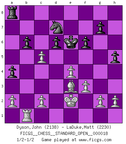 Last move : 1/2-1/2 2024 August 18 18:49:31 [Event "FICGS__CHESS__STANDARD_OPEN__000018"] [Site "FICGS"] [Date "2024.05.19"] [Round "2"] [White "Dyson,John"] [Black "LaDuke,Matt"] [Result "1/2-1/2"] [WhiteElo "2138"] [BlackElo "2230"] 1.e4 e5 2.Nf3 Nc6 3.Bb5 Nf6 4.d3 Bc5 5.Bxc6 dxc6 6.Nbd2 Be6 7.O-O Qd6 8.b3 a5 9.Bb2 Nd7 10.Ng5 a4 11.Ndf3 O-O 12.d4 exd4 13.Nxd4 Bxd4 14.Qxd4 Qxd4 15.Bxd4 Rfe8 16.f3 f6 17.Nxe6 Rxe6 18.Rfd1 Rd6 19.Be3 Kf7 20.Kf1 c5 21.Ke2 b6 22.Rab1 Ke6 23.Rxd6+ cxd6 24.b4 h5 25.bxc5 1/2-1/2 Follow this game move after move (download)I believe that Chess possesses a magic that is also a help in advanced age. A rheumatic knee is forgotten during a game of Chess and other events can seem quite unimportant in comparison with a catastrophe on the chessboard. (Vlastimil Hort) Je mehr wir mit Computern analysieren, desto mehr glauben wir an Verteidigung. (Vladimir Kramnik) Bobby Fischer es el mas grande genio de Ajedrez de todos los tiempos. (Alexander Kotov) Les Echecs sont et restent toujours un combat, un combat intégral comme la boxe, la lutte ou un autre sport, et où il doit y avoir un vainqueur et un vaincu. (Joseph Emil Diemer) A good teacher is like a candle - it consumes itself to light the way for others. (Author unknown)