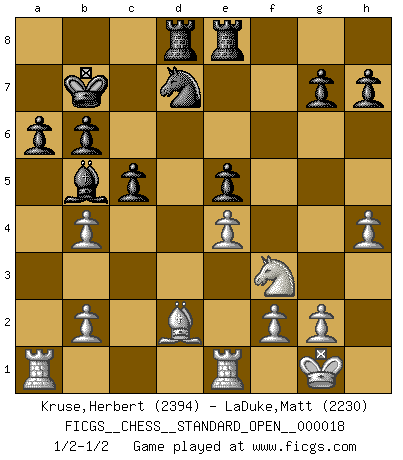 Last move : 1/2-1/2 2024 June 23 22:6:6 [Event "FICGS__CHESS__STANDARD_OPEN__000018"] [Site "FICGS"] [Date "2024.05.19"] [Round "1"] [White "Kruse,Herbert"] [Black "LaDuke,Matt"] [Result "1/2-1/2"] [WhiteElo "2394"] [BlackElo "2230"] 1.e4 e5 2.Nf3 Nc6 3.Bb5 Nf6 4.d3 Bc5 5.Bxc6 dxc6 6.O-O Nd7 7.Nbd2 b6 8.Nc4 f6 9.c3 Ba6 10.Qa4 Bb5 11.Qb3 Qe7 12.Rd1 Qe6 13.Ne3 Qxb3 14.axb3 Bxe3 15.Bxe3 c5 16.b4 cxb4 17.cxb4 a6 18.d4 O-O-O 19.dxe5 fxe5 20.Re1 Rhe8 21.Bd2 c5 22.h4 Kb7 23.Rad1 Ba4 24.Ra1 Bb5 25.Rad1 Ba4 26.Ra1 Bb5 1/2-1/2 Follow this game move after move (download)Fischer is completely natural. He plays no roles. He's like a child. Very, very simple. (Zita Rajcsanyi) Schach ist eine Sache der genauen Beurteilung, wann man zuschlagen und wann man sich ducken muss. (Robert James Fischer) Fischer no está bajo la obligación de nadie. (Joseph Platz) La tactique, c'est ce que vous faites quand il y a quelque chose à faire; la stratégie, c'est ce que vous faites quand il n'y a rien à faire. (Savielli Tartacower) Horse racing is animated roulette. (Roger Kahn)
