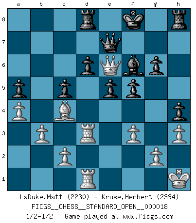 Last move : 1/2-1/2 2024 June 29 4:4:52 [Event "FICGS__CHESS__STANDARD_OPEN__000018"] [Site "FICGS"] [Date "2024.05.19"] [Round "2"] [White "LaDuke,Matt"] [Black "Kruse,Herbert"] [Result "1/2-1/2"] [WhiteElo "2230"] [BlackElo "2394"] 1.e4 c5 2.Nf3 d6 3.d4 cxd4 4.Nxd4 Nf6 5.Nc3 a6 6.f3 e5 7.Nb3 Be6 8.Be3 h5 9.Nd5 Bxd5 10.exd5 Nbd7 11.Qd2 g6 12.Be2 Bg7 13.O-O b6 14.Rad1 h4 15.Rfe1 Kf8 16.a4 Qc7 17.Nc1 Ng8 18.Nb3 Ne7 19.Bd3 a5 20.h3 Nc5 21.Nxc5 bxc5 22.b3 Rb8 23.Be4 Rh5 24.Kh1 f5 25.Bd3 Nxd5 26.Bc4 Nxe3 27.Rxe3 Rd8 28.Qd5 Rh8 29.Red3 Bf6 30.Qe6 Qe7 1/2-1/2 Follow this game move after move (download)A good player is always lucky. (Jose Raul Capablanca) Über Karpov: Er war und ist ein Vertreter der russischen Reaktionäre. Das steckt tief in seiner Seele, wehalb ich nicht nett mit ihm umgehen kann. (Viktor Kortschnoi) ¿Se han dado cuenta de que Fischer casi nunca ha tenido piezas malas? El las intercambia y las piezas malas se quedan con sus oponenets. (Yuri Balashov) Pour moi, les échecs ne sont pas un jeu mais un art. (Alexandre Alekhine) He is a liar. I just don't know what the lie is yet. (Horatio Caine, C.S.I. Miami)