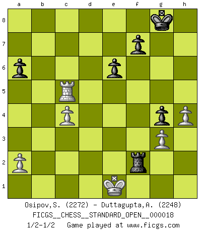 Last move : 1/2-1/2 2024 August 8 21:52:9 [Event "FICGS__CHESS__STANDARD_OPEN__000018"] [Site "FICGS"] [Date "2024.05.19"] [Round "1"] [White "Osipov,Sergey"] [Black "Duttagupta,Aniruddha"] [Result "1/2-1/2"] [WhiteElo "2272"] [BlackElo "2248"] 1.d4 d5 2.c4 c6 3.Nf3 Nf6 4.Nc3 e6 5.Bg5 h6 6.Bh4 dxc4 7.e4 g5 8.Bg3 b5 9.Be2 Bb7 10.h4 g4 11.Ne5 Nbd7 12.Nxd7 Qxd7 13.Be5 Qe7 14.O-O Rg8 15.b3 Bg7 16.Qc2 Nh5 17.Bxg7 Rxg7 18.g3 Qd6 19.e5 Qxd4 20.Ne4 Qxe5 21.Rad1 Kf8 22.Rfe1 c5 23.Bxc4 bxc4 24.Nd6 Qf6 25.Nxb7 Qf3 26.Qd2 Qxb7 27.Qxh6 Nxg3 28.fxg3 Kg8 29.bxc4 Qf3 30.Qe3 Qxe3+ 31.Rxe3 Rg6 32.Re5 Rc8 33.Rd7 a6 34.Kg2 Kf8 35.Rh5 Kg8 36.Kf2 Rf6+ 37.Ke2 Rb8 38.Rxc5 Rb2+ 39.Rd2 Rxd2+ 40.Kxd2 Rf2+ 41.Ke1 1/2-1/2 Follow this game move after move (download)Even the laziest King flees wildly in the face of a double check ! (Aaron Nimzowitsch) Man gibt nur Pakete auf. (Paul Keres) Una buena ofensiva y una buena defensa, comienzan ambas con un buen desarrollo. (Bruce A. Moon) Ce qui caractérise les parties de combat, c'est que si le défenseur a constamment de difficiles problèmes à résoudre, l'attaquant doit chercher sans relâche de nouvelles possibilités d'attaque. (Koblentz) When a man with money meets a man with experience, the man with experience leaves with money and the man with money leaves with experience. (Anonymous)