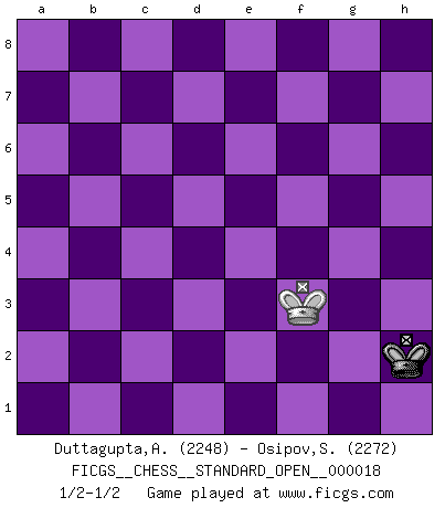 Last move : 1/2-1/2 2024 October 28 19:41:9 [Event "FICGS__CHESS__STANDARD_OPEN__000018"] [Site "FICGS"] [Date "2024.05.19"] [Round "2"] [White "Duttagupta,Aniruddha"] [Black "Osipov,Sergey"] [Result "1/2-1/2"] [WhiteElo "2248"] [BlackElo "2272"] 1.c4 Nf6 2.g3 e5 3.Bg2 c6 4.d4 e4 5.Nc3 d5 6.a3 Be7 7.f3 exf3 8.Nxf3 dxc4 9.e4 O-O 10.O-O Nbd7 11.Nh4 Nb6 12.a4 a5 13.h3 Ne8 14.Kh2 Bxh4 15.gxh4 Qxh4 16.b3 Nd6 17.Ba3 Qh6 18.b4 Re8 19.Qf3 f5 20.e5 axb4 21.Bxb4 Nf7 22.a5 Nd7 23.a6 Ndxe5 24.dxe5 Nxe5 25.Qg3 Nd3 26.axb7 Bxb7 27.Qd6 Rxa1 28.Rxa1 Qg5 29.Bc5 h6 30.Rg1 Qd8 31.Qxd8 Rxd8 32.Be3 Bc8 33.Rb1 Be6 34.Bb6 Rd6 35.Ba5 c5 36.Nb5 Ra6 37.Ra1 Bf7 38.Bc3 Rxa1 39.Bxa1 g5 40.Bb7 Kf8 41.Bc8 f4 42.Bf6 f3 43.Kg1 Bd5 44.Nc3 f2+ 45.Kf1 Bc6 46.h4 gxh4 47.Bxh4 Ke8 48.Bf5 Bd7 49.Bg6+ Kf8 50.Bxd3 cxd3 51.Kxf2 Bf5 52.Nd5 c4 53.Ke3 Kf7 54.Nc3 Kg6 55.Kd2 Be6 56.Ke3 Kf5 57.Be1 h5 58.Ne4 Bd5 59.Nc5 Bc6 60.Ba5 Kg4 61.Bc7 h4 62.Nxd3 cxd3 63.Kxd3 Kf3 64.Bd8 h3 65.Bc7 Bb5+ 66.Kd4 Bd7 67.Bb8 Bc8 68.Bd6 Kg2 69.Kc4 Be6+ 70.Kd4 Bg4 71.Bc7 Bc8 72.Bd6 h2 73.Bxh2 Kxh2 74.Ke3 Bb7 75.Kf4 Bf3 76.Kxf3 1/2-1/2 Follow this game move after move (download)Up to this point White has been following well-known analysis. But now he makes a fatal error: he begins to use his own head. (Siegbert Tarrasch) Das Schachspiel hat wie die Liebe, die Musik, die Fähigkeit, den Menschen glücklich zu machen. Ich habe ein leises Gefühl des Bedauerns für jeden, der das Schachspiel nicht kennt, so wie ich jeden bedaure, der die Liebe nicht kennt. (Siegbert Tarrasch) Coloca el contenido del tablero de Ajedrez en un sombrero, agita las piezas vigorosamente, derrámalas en el tablero desde una altura de medio metro y así obtienes el estilo de Wilhelm Steinitz. (H. E. Bird) Les Cavaliers se révèlent fort utiles dans les positions fermées. D'habitude, les Fous sont un peu plus forts que les Cavaliers dans les positions ouvertes. Qu'on le veuille ou non, il restera toujours des exceptions ! Real knowledge is to know the extent of one's ignorance. (Confucius)