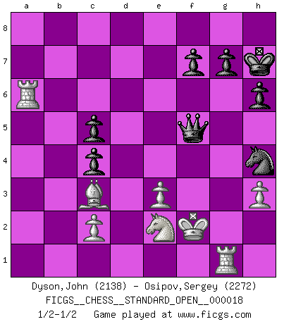 Last move : 1/2-1/2 2024 October 23 12:48:33 [Event "FICGS__CHESS__STANDARD_OPEN__000018"] [Site "FICGS"] [Date "2024.05.19"] [Round "1"] [White "Dyson,John"] [Black "Osipov,Sergey"] [Result "1/2-1/2"] [WhiteElo "2138"] [BlackElo "2272"] 1.e4 e5 2.Nf3 Nc6 3.Bb5 Nf6 4.d3 Bc5 5.Bxc6 dxc6 6.Nbd2 O-O 7.Nc4 Nd7 8.O-O Re8 9.Kh1 b5 10.Ne3 a5 11.a4 Nb6 12.Qe1 Qe7 13.Bd2 bxa4 14.Bxa5 Bxe3 15.fxe3 c5 16.Qc3 Bg4 17.Nd2 h6 18.h3 Bd7 19.b4 axb3 20.Qxb3 Be6 21.Qb2 Qd6 22.Kh2 Nd7 23.Qb7 Rac8 24.Ra4 Nf8 25.Rb1 Kh7 26.Bc3 Rb8 27.Qxb8 Rxb8 28.Rxb8 Ng6 29.Rb1 Qe7 30.Rf1 Qg5 31.Rf3 Qd8 32.Ra6 Qb8 33.Rf1 Qe8 34.Nf3 c4 35.d4 exd4 36.Nxd4 Bxh3 37.gxh3 Qe5+ 38.Kg2 Qxe4+ 39.Kf2 c5 40.Ne2 Nh4 41.Rg1 Qf5+ 1/2-1/2 Follow this game move after move (download)It's always better to sacrifice your opponent's men. (Savielly Tartakover) Du musst Deinen Gegner in einen tiefen dunklen Wald führen wo 2+2=5 ist und wo der Weg, der wieder hinausführt, nur breit genug für einen ist. (Mikhail Nekhemyevich Tal) Todos los jugadores de Ajedrez deberían tener un pasatiempo. (Savielly Tartakower) Il n'y a plus de joueurs du niveau de Jacob Murray dont la seule quête est le beau jeu, le plaisir de voir les pièces construire quelque chose. Sur 10 idées à la minute, 9 seront sans intérêt, la dernière s'avèrera géniale. (Christian Bauer) I'll be back. (Arnold Schwarzenegger)