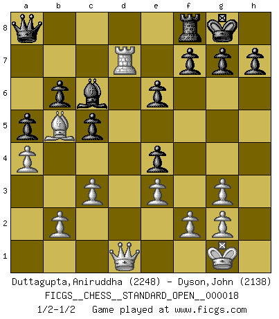 Last move : 1/2-1/2 2024 September 17 10:54:53 [Event "FICGS__CHESS__STANDARD_OPEN__000018"] [Site "FICGS"] [Date "2024.05.19"] [Round "1"] [White "Duttagupta,Aniruddha"] [Black "Dyson,John"] [Result "1/2-1/2"] [WhiteElo "2248"] [BlackElo "2138"] 1.d4 d5 2.Nf3 Nf6 3.Bf4 e6 4.e3 Bd6 5.Bg3 O-O 6.Nbd2 b6 7.c3 c5 8.Bd3 Bb7 9.O-O a5 10.Qe2 Bxg3 11.hxg3 Nbd7 12.Rad1 Ne4 13.Ne5 Nxe5 14.dxe5 Qc7 15.Nxe4 dxe4 16.Bb5 Rad8 17.Rd6 Rxd6 18.exd6 Qxd6 19.Rd1 Qc7 20.Rd7 Qc8 21.Rd6 Qb8 22.Qd1 Bd5 23.Rd7 Qa8 24.Rd6 Qb8 25.Rd7 Qa8 26.a4 Bc6 1/2-1/2 Follow this game move after move (download)Live, lose, and learn, by observing your opponent how to win. (Amber Steenbock) Die meiste Zeit treffe ich auf Gegner, die meine Enkel sein könnten. Ich bin da, um ihnen zu zeigen, dass sie von mir noch einiges lernen können. (Viktor Kortschnoi) Nos gusta pensar. (Gary Kasparov) Il vaut mieux sacrifier les pièces de l'adversaire. (Xavier Tartacover) Indecision is the key to flexibility. (Unknown)