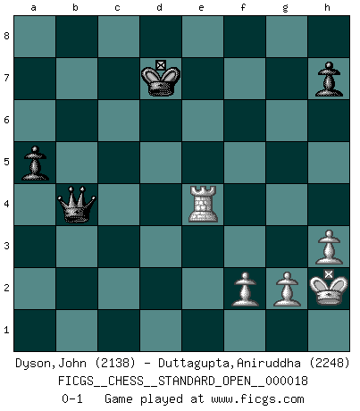 Last move : 0-1 2025 May 11 12:46:2 [Event "FICGS__CHESS__STANDARD_OPEN__000018"] [Site "FICGS"] [Date "2024.05.19"] [Round "2"] [White "Dyson,John"] [Black "Duttagupta,Aniruddha"] [Result "0-1"] [WhiteElo "2138"] [BlackElo "2248"] 1.e4 c5 2.Nf3 d6 3.Bb5+ Nd7 4.c3 Ngf6 5.Qe2 a6 6.Ba4 b5 7.Bc2 Bb7 8.d4 e6 9.O-O Be7 10.Re1 O-O 11.Nbd2 Qc7 12.Bd3 e5 13.dxc5 Nxc5 14.Bc2 Rac8 15.h3 g6 16.Ng5 Rfe8 17.Ngf3 Red8 18.Rd1 d5 19.exd5 Nxd5 20.Nf1 e4 21.Nd4 b4 22.Bd2 Bf6 23.cxb4 Nd3 24.Bxd3 exd3 25.Qxd3 Ne7 26.Bc3 Nf5 27.Nxf5 Rxd3 28.Nh6+ Kf8 29.Rxd3 Bxc3 30.Rxc3 Qd7 31.Rxc8+ Qxc8 32.Ng4 Qc2 33.b3 Qb2 34.Rd1 Qxa2 35.Nd2 Kg7 36.Ne3 Qa3 37.Nc2 Qb2 38.Ne3 Qc3 39.Nef1 Bc6 40.Re1 Qxb4 41.Re3 f5 42.Rd3 Qb7 43.Nf3 Bd5 44.N1d2 Qb5 45.Rc3 Kf6 46.Nd4 Qa5 47.Rd3 Qa1+ 48.Kh2 Be4 49.Nxe4+ fxe4 50.Rd2 Qc3 51.Rd1 a5 52.Ne2 Qc2 53.Rd6+ Ke7 54.Re6+ Kd7 55.Nf4 g5 56.Rf6 gxf4 57.Rxf4 Qxb3 58.Rxe4 Qb4 0-1 Follow this game move after move (download)When you are lonely, when you feel yourself an alien in the world, play Chess. This will raise your spirits and be your counselor in war. (Aristotle) Alles was am Schachbrett zählt sind gute Züge. (Robert James Fischer) Es muy difícil jugar en contra de la teoría de Einstein. - en su primera derrota en contra de Fischer (Mikhail Tal) Plusieurs personnes se sont demandées comment Tal faisait pour gagner... En fait, c'est très simple ! Il met ses pièces au centre de l'échiquier et les sacrifie quelque part ! (David Bronstein) The leaves of memory seemed to make a mournful rustling in the dark. (Henry Wadsworth Longfellow)
