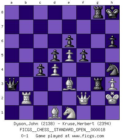 Last move : 0-1 2025 July 23 14:11:0 [Event "FICGS__CHESS__STANDARD_OPEN__000018"] [Site "FICGS"] [Date "2024.05.19"] [Round "1"] [White "Dyson,John"] [Black "Kruse,Herbert"] [Result "0-1"] [WhiteElo "2138"] [BlackElo "2394"] 1.e4 c5 2.Nf3 d6 3.Bb5+ Nd7 4.c3 Ngf6 5.Qe2 a6 6.Ba4 b5 7.Bc2 e6 8.d4 Be7 9.a4 Bb7 10.O-O O-O 11.h3 Qb8 12.Re1 Rc8 13.Bd3 bxa4 14.Rxa4 a5 15.Ra1 a4 16.Bg5 h6 17.Bf4 Bc6 18.Na3 Qb7 19.e5 Ne8 20.Nb5 Bxf3 21.gxf3 d5 22.Bc2 c4 23.Na3 Rc6 24.Kh2 f5 25.Rg1 Kh7 26.Nb1 Rca6 27.Bc1 Nf8 28.Bd1 Ng6 29.Na3 Nh4 30.Qe3 Nc7 31.f4 Rg8 32.Qg3 Nb5 33.Nc2 g6 34.Kh1 Bd8 35.Bd2 Ra7 36.Ra2 Qb8 37.Qe3 Qa8 38.Bc1 Kh8 39.Kh2 Re8 40.Qe1 Rg8 41.Qe3 Rag7 42.Ne1 a3 43.bxa3 g5 44.fxg5 Bxg5 45.f4 Nxc3 46.Qxc3 Bxf4+ 47.Bxf4 Rxg1 48.Be3 R1g3 49.Qd2 Qb7 50.Rb2 Qa7 51.Qf2 Qxa3 0-1 This chess game has been lost on time (started : 2024.05.19 2:5:4) Follow this game move after move (download)By playing at Chess then, we may learn: First: Foresight... Second: Circumspection... Third: Caution... And lastly, we learn by Chess the habit of not being discouraged by present bad appearances in the state of our affairs, the habit of hoping for a favorable chance, and that of persevering in the secrets of resources. (Benjamin Franklin) Charakterschwächen offenbaren sich normalerweise während einer Schachpartie. (Garry Kasparov) Cuando tu casa esta en llamas, no puedes ser molestado por tus vecinos. O, como decinos en Ajedrez, si tu Rey esta bajo ataque, no te preocupa perder un Peón del lado de la Reina. (Gary Kasparov) Mon pion favori sur ma case favorite ! Bronstein en parlant d'un coup de pion en h5 quand il avait les Noirs. Art is the only way to run away without leaving home. (Twyla Tharp)