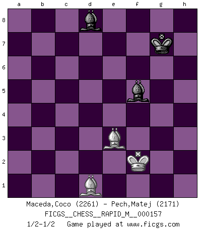 Last move : 1/2-1/2 2024 September 7 20:54:23 [Event "FICGS__CHESS__RAPID_M__000157"] [Site "FICGS"] [Date "2024.05.19"] [Round "1"] [White "Maceda,Coco"] [Black "Pech,Matej"] [Result "1/2-1/2"] [WhiteElo "2261"] [BlackElo "2171"] 1.Nf3 Nf6 2.c4 c5 3.Nc3 Nc6 4.d4 cxd4 5.Nxd4 e6 6.a3 Bc5 7.Nb3 Bb6 8.c5 Bc7 9.g3 O-O 10.Bg2 b6 11.O-O Be5 12.a4 bxc5 13.Nxc5 d5 14.e4 Rb8 15.exd5 exd5 16.Nxd5 Nxd5 17.Qxd5 Qxd5 18.Bxd5 Nd4 19.Be3 Rd8 20.Be4 Bh3 21.Nb7 Rd7 22.Nc5 R7d8 23.Nb7 Rd7 24.Rfd1 Ne2+ 25.Kh1 Bxb2 26.Rxd7 Bxd7 27.Re1 Nc3 28.Nc5 Be8 29.Bf3 Nxa4 30.Nxa4 Bxa4 31.Bxa7 Rd8 32.Rb1 Bf6 33.Rb8 Rxb8 34.Bxb8 g5 35.Kg2 Bd8 36.g4 Bd7 37.Kg3 f6 38.h4 h6 39.hxg5 hxg5 40.Bd1 Bb6 41.f4 gxf4+ 42.Bxf4 Bd8 43.Kf2 Kg7 44.Be3 f5 45.gxf5 Bxf5 1/2-1/2 Follow this game move after move (download)Fischer prefers to enter Chess history alone. (Miguel Najdorf) Am wohlsten fühle ich mich, wenn ich sehe, wie sich mein Gegner im Todeskampf windet. (Robert James Fischer) Bobby Fischer es el mas grande genio de Ajedrez de todos los tiempos. (Alexander Kotov) Une platitude souvent récitée à propos des Echecs est qu'une des choses les plus difficiles à réaliser est de gagner une position gagnante. Cela ne manque pas de sens mais, pour ma part, j'ai toujours trouvé plus difficile de gagner une position perdante. (Tim Krabbe) Always two there are. No more no less. A master, and an apprentice. (Master Yoda in Star Wars ep.1)