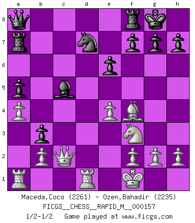 Last move : 1/2-1/2 2024 July 12 23:55:42 [Event "FICGS__CHESS__RAPID_M__000157"] [Site "FICGS"] [Date "2024.05.19"] [Round "1"] [White "Maceda,Coco"] [Black "Ozen,Bahadir"] [Result "1/2-1/2"] [WhiteElo "2261"] [BlackElo "2235"] 1.Nf3 d5 2.d4 Nf6 3.c4 e6 4.Nc3 c6 5.e3 Nbd7 6.Qc2 Bd6 7.Bd3 O-O 8.O-O dxc4 9.Bxc4 a6 10.Rd1 b5 11.Bf1 c5 12.a4 b4 13.Ne4 Nxe4 14.Qxe4 Ra7 15.Qd3 a5 16.e4 Ba6 17.Qc2 Bxf1 18.Kxf1 Qa8 19.dxc5 Bxc5 20.Bf4 b3 1/2-1/2 Follow this game move after move (download)Only the player with the initiative has the right to attack. (Wilhelm Steinitz) Gewöhnliche Menschen denken nur daran, wie sie ihre Zeit verbringen. Ein intelligenter Mensch versucht, sie auszunutzen. (Arthur Schopenhauer) Ayuda a tus piezas para que ellas te puedan ayudar. (Paul Morphy) Celui qui prend des risques peut perdre, celui qui n'en prend pas perd toujours. (Xavier Tartacover) A proverb is a short sentence based on long experience. (Miguel de Cervantes)