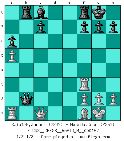 Last move : 1/2-1/2 2024 July 21 22:2:24 [Event "FICGS__CHESS__RAPID_M__000157"] [Site "FICGS"] [Date "2024.05.19"] [Round "1"] [White "Swiatek,Janusz"] [Black "Maceda,Coco"] [Result "1/2-1/2"] [WhiteElo "2239"] [BlackElo "2261"] 1.e4 e5 2.Nf3 Nc6 3.Bb5 a6 4.Ba4 Nf6 5.O-O Be7 6.Re1 b5 7.Bb3 O-O 8.a4 b4 9.c3 d6 10.a5 Rb8 11.Bc4 d5 12.exd5 Nxd5 13.d4 bxc3 14.Nxc3 Nxc3 15.bxc3 exd4 16.Nxd4 Nxd4 17.cxd4 Bb4 18.Re3 Bc5 19.Ba3 Qxd4 20.Bxc5 Qxc5 21.Qc1 Qd6 22.Rd3 Qf6 23.Rf3 Qb2 24.Qe1 Qb4 25.Qc1 Qb2 26.Bf1 1/2-1/2 Follow this game move after move (download)That's what Chess is all about. One day you give your opponent a lesson, the next day he gives you one. (Bobby Fischer) Nur ein wirklich starker Spieler weiß wie schwach er spielt. (Savielly Grigorievitsch Tartakower) El Ajedrez es parte de la cultura, y si una cultura esta en decadencia, entonces también el Ajedrez declinará. (Mikhail Botvinnik) Les Echecs sont et restent toujours un combat, un combat intégral comme la boxe, la lutte ou un autre sport, et où il doit y avoir un vainqueur et un vaincu. (Joseph Emil Diemer) To steal ideas from one person is plagiarism. To steal from many is research. (Unknown)