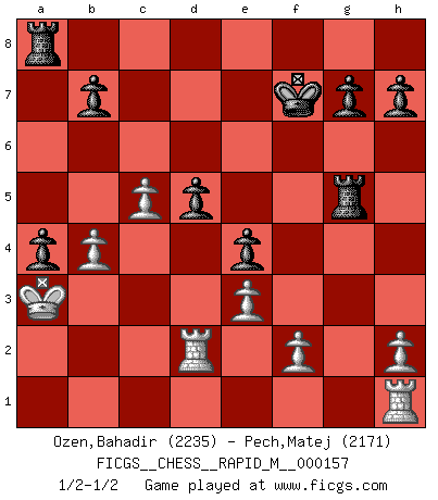 Last move : 1/2-1/2 2024 August 9 4:23:5 [Event "FICGS__CHESS__RAPID_M__000157"] [Site "FICGS"] [Date "2024.05.19"] [Round "1"] [White "Ozen,Bahadir"] [Black "Pech,Matej"] [Result "1/2-1/2"] [WhiteElo "2235"] [BlackElo "2171"] 1.c4 e5 2.Nc3 Nc6 3.Nf3 f5 4.g3 Nf6 5.d4 e4 6.Nh4 Bb4 7.Nxf5 d5 8.Ne3 dxc4 9.d5 Bxc3+ 10.bxc3 Ne7 11.Ba3 Nexd5 12.Nxc4 Nb6 13.Qb3 Qd5 14.Ne3 Qxb3 15.axb3 a5 16.c4 a4 17.c5 Nbd7 18.b4 O-O 19.Bb2 Re8 20.g4 c6 21.g5 Nd5 22.Nxd5 cxd5 23.e3 Ne5 24.Bb5 Bd7 25.Bxd7 Nxd7 26.O-O-O Ne5 27.Bxe5 Rxe5 28.Rd2 Rxg5 29.Kb2 Kf7 30.Ka3 1/2-1/2 Follow this game move after move (download)Chess is war over the board. The object is to crush the opponents mind. (Bobby Fischer) Ich verstehe Aljechins Kombinationen ganz gut; aber woher er diese Angriffschancen bekommt und wie er die Eröffnung behandelt das ist für mich ein Buch mit sieben Siegeln. (Rudolf Spielmann) Observen a Garry Kasparov. Después de una derrota, invariablemente el gana la próxima partida. Prácticamente hace pedazos a su siguiente oponente. Eso es algo que tenemos que aprender a lograr. (Maurice Ashley) Pour moi, les échecs ne sont pas un jeu mais un art. (Alexandre Alekhine) A woman without a man is like a fish without a bicycle. (Gloria Steinem)