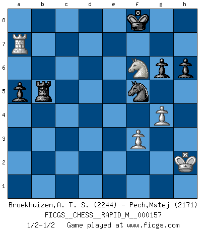 Last move : 1/2-1/2 2024 November 11 19:45:49 [Event "FICGS__CHESS__RAPID_M__000157"] [Site "FICGS"] [Date "2024.05.19"] [Round "1"] [White "Broekhuizen,A. T. S."] [Black "Pech,Matej"] [Result "1/2-1/2"] [WhiteElo "2244"] [BlackElo "2171"] 1.e4 e5 2.Nf3 Nc6 3.Bb5 a6 4.Ba4 Nf6 5.O-O Be7 6.Re1 b5 7.Bb3 d6 8.c3 O-O 9.h3 Re8 10.a4 Bd7 11.d4 h6 12.Nbd2 Bf8 13.d5 Na5 14.Bc2 c6 15.b4 Nc4 16.Nxc4 bxc4 17.Nh2 cxd5 18.exd5 Rc8 19.Nf1 g6 20.Be3 Bf5 21.Bb1 Bg7 22.Ng3 Bxb1 23.Rxb1 Rb8 24.Qf3 Kh7 25.h4 e4 26.Qd1 Nd7 27.h5 Bxc3 28.hxg6+ fxg6 29.Bd2 Bg7 30.Qc2 Qh4 31.Rxe4 Rxe4 32.Qxe4 Qxe4 33.Nxe4 Nb6 34.Rc1 c3 35.Bxc3 Bxc3 36.Rxc3 Nxd5 37.Rd3 Rxb4 38.f3 Nf4 39.Rxd6 Rxa4 40.Rd7+ Kg8 41.Nf6+ Kf8 42.Kh2 a5 43.Nh7+ Kg8 44.Nf6+ Kf8 45.Kg3 Ne2+ 46.Kf2 Nd4 47.Nh7+ Kg8 48.Nf6+ Kf8 49.Kg3 Nf5+ 50.Kh2 Rh4+ 51.Kg1 Ne7 52.Ne4 Rh5 53.Ra7 Rd5 54.Kh2 Nf5 55.Nf6 Rb5 56.g4 1/2-1/2 Follow this game move after move (download)You may learn much more from a game you lose than from a game you win. You will have to lose hundreds of games before becoming a good player. (Jose Raul Capablanca) Wenn du gegen Bobby spielst, ist es keine Frage von gewinnen oder verlieren. Es ist eine Frage des Überlebens. (Boris Vassilievich Spassky) Un mal plan es mejor que no tener ningún plan. (Frank Marshall) On n'a jamais que l'âge auquel on a commence à jouer aux échecs car après on cesse de vieillir. (Capablanca) In my experience, there's no such thing as luck. (Obi-Wan Kenobi in Star Wars ep.4)