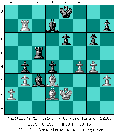Last move : 1/2-1/2 2024 July 5 6:8:6 [Event "FICGS__CHESS__RAPID_M__000157"] [Site "FICGS"] [Date "2024.05.19"] [Round "1"] [White "Knittel,Martin"] [Black "Cirulis,Ilmars"] [Result "1/2-1/2"] [WhiteElo "2145"] [BlackElo "2258"] 1.Nf3 Nf6 2.c4 g6 3.Nc3 c5 4.e4 Nc6 5.d4 cxd4 6.Nxd4 d6 7.f3 Nxd4 8.Qxd4 Bg7 9.Be3 O-O 10.Qd2 Qa5 11.Be2 Be6 12.Rc1 Rfc8 13.b3 a6 14.Na4 Qxd2+ 15.Kxd2 Nd7 16.h3 Rab8 17.g4 b5 18.cxb5 Rxc1 19.Rxc1 axb5 20.Nc3 b4 21.Nb5 Nc5 22.Nc7 Be5 23.Kd1 Kg7 24.Bc4 Bd7 25.Ke2 Kf8 26.f4 Bb2 27.Rc2 Ba1 28.e5 Ne6 29.exd6 exd6 30.Nxe6+ fxe6 31.Bd3 Ke8 32.Rc7 Ra8 33.Bb1 Bc3 34.Rb7 Kd8 35.Bb6+ Ke8 36.Be3 Kd8 37.Bb6+ Ke8 38.Ke3 Bb2 39.Kf2 Rc8 40.Be3 d5 41.Bd3 d4 42.Bd2 Bc3 43.Ke2 Rc5 44.Rb8+ Rc8 45.Rb7 Rc5 1/2-1/2 Follow this game move after move (download)When in doubt... play Chess ! (Tevis) Jeder weiß, dass Gasprom Putins persönliches Machtinstrument ist. Die Firma wird vom Kreml aus geleitet und wird schon deshalb nie transparent sein. (Garry Kasparov) Las Aperturas te enseñan aperturas. ¡Los Finales te enseñan Ajedrez!. (Stephan Gerzadowicz) Le jeu d'échecs fait naître et fortifie en nous plusieurs qualités précieuses dans le cours de l'existence, telles que la prévoyance, la circonspection, la prudence, et la persévérance. (Benjamin Franklin - 1783, la morale des échecs) If everyone is thinking alike, then somebody isn't thinking. (US General George S. Patton)