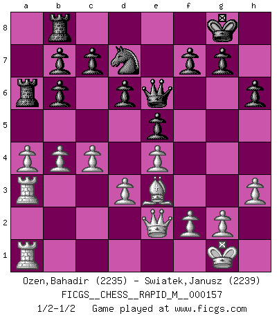 Last move : 1/2-1/2 2024 June 26 22:36:31 [Event "FICGS__CHESS__RAPID_M__000157"] [Site "FICGS"] [Date "2024.05.19"] [Round "1"] [White "Ozen,Bahadir"] [Black "Swiatek,Janusz"] [Result "1/2-1/2"] [WhiteElo "2235"] [BlackElo "2239"] 1.c4 e5 2.Nc3 Nf6 3.Nf3 Nc6 4.e4 Bb4 5.d3 d6 6.a3 Bc5 7.b4 Bb6 8.Be3 Bg4 9.Be2 O-O 10.O-O Bxf3 11.Bxf3 Nd4 12.Na4 Qe8 13.Nxb6 Nxf3+ 14.Qxf3 axb6 15.Qe2 Qe6 16.h3 Nd7 17.a4 h6 18.Rfb1 Rfb8 19.Rb3 Ra6 20.Rba3 1/2-1/2 Follow this game move after move (download)Look at Garry Kasparov. After he loses, invariably he wins the next game. He just kills the next guy. That's something that we have to learn to be able to do. (Maurice Ashley) Über Karpov: Er war und ist ein Vertreter der russischen Reaktionäre. Das steckt tief in seiner Seele, wehalb ich nicht nett mit ihm umgehen kann. (Viktor Kortschnoi) Todo lo que importa ante el tablero de Ajedrez son buenas jugadas. (Bobby Fischer) Il n'y a pas eu de défaite parce que je ne crois pas que cet ordinateur ait jamais existé. IBM a triché en refusant d'imprimer les modes de recherche de la machine. C'est évident, pendant le match, des coups décisifs ont été joués par des êtres humains. Aujourd'hui, les meilleurs spécialistes en informatique ne peuvent toujours pas expliquer comment Deep-Blue a pu jouer contre la logique des ordinateurs. IBM a gagné une guerre de communication, mais ils sont incapables de prouver que l'ordinateur a gagné tout seul. (Garry Kasparov) You cannot beat a roulette table unless you steal money from it. (Albert Einstein)