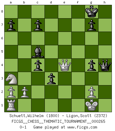 Last move : 0-1 2024 November 15 21:5:15 [Event "FICGS__CHESS__THEMATIC_TOURNAMENT__000265"] [Site "FICGS"] [Date "2024.05.20"] [Round "1"] [White "Schuett,Wilhelm"] [Black "Ligon,Scott"] [Result "0-1"] [WhiteElo "1800"] [BlackElo "2372"] 1.e4 e5 2.Nf3 Nc6 3.Bc4 Nf6 4.Ng5 d5 5.exd5 Nxd5 6.d4 Nxd4 7.c3 b5 8.Bd3 h6 9.Nxf7 Kxf7 10.cxd4 exd4 11.O-O Rb8 12.Qh5+ Kg8 13.Re1 Nf6 14.Qg6 Rb6 15.Na3 Ng4 16.Qe8 Qh4 17.h3 Qxf2+ 18.Kh1 Bb7 19.Bf1 h5 20.Bg5 Qg3 21.hxg4 hxg4 22.Kg1 Rh2 23.Re4 Rbh6 24.Bxh6 Qh4 25.Bc4+ bxc4 26.Kf1 d3 27.Be3 Bxe4 28.Qxe4 Rh1+ 29.Bg1 Rxg1+ 30.Kxg1 Bc5+ 0-1 Follow this game move after move (download)Checkers is for tramps. (Paul Morphy) Ein typischer, sehr verbreiteter Gedankenschädling ist der, daß der betreffende Amateur von der Annanhme ausgeht, daß jeder einzelne Zug etwas zu leisten habe. (Aaron Nimzowitsch) Desconfianza es la característica mas necesaria de un jugador de Ajedrez. (Siegbert Tarrasch) Le système Elo représente seulement une moyenne. Il est simplement un indicateur de votre stabilité. (Anatoli Karpov) Secret operations are essential in war; upon them the army relies to make its every move. (Sun Tzu)