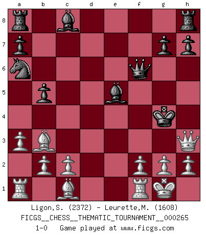 Last move : 1-0 2024 May 23 14:33:56 [Event "FICGS__CHESS__THEMATIC_TOURNAMENT__000265"] [Site "FICGS"] [Date "2024.05.20"] [Round "1"] [White "Ligon,Scott"] [Black "Leurette,Marc-Antoine"] [Result "1-0"] [WhiteElo "2372"] [BlackElo "1608"] 1.e4 e5 2.Nf3 Nc6 3.Bc4 Nf6 4.Ng5 d5 5.exd5 Nxd5 6.Nxf7 Kxf7 7.Qf3+ Ke6 8.Nc3 Ncb4 9.O-O c6 10.d4 Qf6 11.Qd1 Bd6 12.a3 b5 13.Bb3 Na6 14.Nxd5 cxd5 15.dxe5 Bxe5 16.Qxd5+ Kf5 17.Qd3+ Kg4 18.Qh3+ 1-0 Follow this game move after move (download)Becoming successful at Chess allows you to discover your own personality. That's what I want for the kids I teach. (Saudin Robovic) Wie kann ich Remis annehmen? Ich weiß ja gar nicht, wie ich stehe! (Fritz Sämisch) No soy una persona materialista y por eso, no resiento la falta o pérdida del dinero. La ausencia de cosas mundanas carece de importancia. Ya que el Ajedrez es una forma en la que puedo ser tan materialista como yo desee sin tener la necesidad de vender mi alma. (Jamie Walter Adams) Ce qui est bien, c'est d'avoir tout un tas de pièces en prise : l'adversaire ne peut en prendre qu'une à la fois. Cité par Thierry Audin. Mandala - that's it! 16x16 squares as multiple of the four and the eight because of the Four Noble Truths and the Noble Eightfold Path. (Heinz-Georg Lehnhoff about Big Chess)