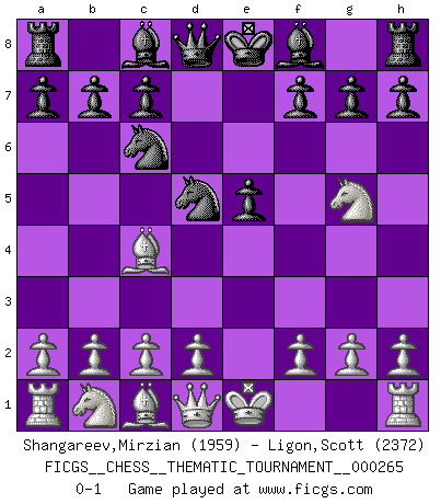 Last move : 0-1 2024 June 29 11:29:54 [Event "FICGS__CHESS__THEMATIC_TOURNAMENT__000265"] [Site "FICGS"] [Date "2024.05.20"] [Round "1"] [White "Shangareev,Mirzian"] [Black "Ligon,Scott"] [Result "0-1"] [WhiteElo "1959"] [BlackElo "2372"] 1.e4 e5 2.Nf3 Nc6 3.Bc4 Nf6 4.Ng5 d5 5.exd5 Nxd5 0-1 This chess game has been lost on time (started : 2024.05.20 4:12:38) Follow this game move after move (download)Chess is a more highly symbolic game, but the aggressions are therefore even more frankly represented in the play. It probably began as a war game; that is, the representation of a miniature battle between the forces of two kingdoms. (Karl Meninger) Frage: Was machen Sie mit den Preisen? Anwort: Ich habe Angst, dass meine Freundin davon neue Kleider kauft. (Loek van Wely) Bobby es el jugador de Ajedrez mas fino que este país jamás haya producido. Su memoria para las movidas, su brillantez en soñar combinaciones y su feróz determinación por la victoria son algo extraño. (John Collins) Les Echecs sont et restent toujours un combat, un combat intégral comme la boxe, la lutte ou un autre sport, et où il doit y avoir un vainqueur et un vaincu. (Joseph Emil Diemer) Coffee just isn't my cup of tea. (Unknown)