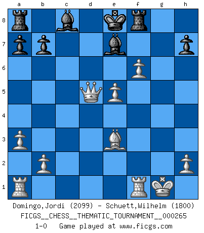 Last move : 1-0 2024 October 23 0:57:32 [Event "FICGS__CHESS__THEMATIC_TOURNAMENT__000265"] [Site "FICGS"] [Date "2024.05.20"] [Round "1"] [White "Domingo,Jordi"] [Black "Schuett,Wilhelm"] [Result "1-0"] [WhiteElo "2099"] [BlackElo "1800"] 1.e4 e5 2.Nf3 Nc6 3.Bc4 Nf6 4.Ng5 d5 5.exd5 Nxd5 6.Nxf7 Kxf7 7.Qf3+ Ke6 8.Nc3 Ncb4 9.Bb3 c6 10.a3 Na6 11.Nxd5 cxd5 12.d4 Nc7 13.c4 Be7 14.cxd5+ Nxd5 15.O-O Rf8 16.Qe4 Qd6 17.Be3 Rf5 18.g4 g6 19.f4 Rf8 20.dxe5 Qc6 21.Bxd5+ Qxd5 22.f5+ gxf5 23.gxf5+ Kd7 24.Qxd5+ Ke8 25.f6 1-0 Follow this game move after move (download)Combinations have always been the most intriguing aspect of Chess. The masters look for them, the public applauds them, the critics praise them. It is because combinations are possible that Chess is more than a lifeless mathematical exercise. They are the poetry of the game; they are to Chess what melody is to music. They represent the triumph of mind over matter. (Reuben Fine) Im Hotelzimmer gab es nur zwei Schaben. (Über die Turnierbedingungen) (Peter Swidler) Cuando la partida de Ajedrez termina, el Peón y el Rey regresan a la misma caja. (Irish saying) Les Echecs, c'est l'art de la guerre sans les charniers, c'est la résurrection des morts tombés au champ d'honneur, l'espoir perpétuel, la suprématie de l'intelligence sur la force, la culture de l'esprit. (F. Szpiner) How many people work in NATO Headquarters ? - About half of them. (Dirk Stikker, NATO general secretary)