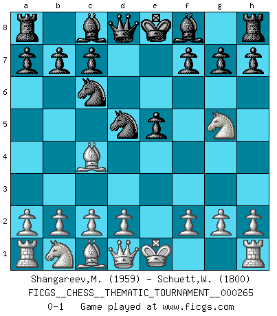 Last move : 0-1 2024 June 29 11:29:54 [Event "FICGS__CHESS__THEMATIC_TOURNAMENT__000265"] [Site "FICGS"] [Date "2024.05.20"] [Round "1"] [White "Shangareev,Mirzian"] [Black "Schuett,Wilhelm"] [Result "0-1"] [WhiteElo "1959"] [BlackElo "1800"] 1.e4 e5 2.Nf3 Nc6 3.Bc4 Nf6 4.Ng5 d5 5.exd5 Nxd5 0-1 This chess game has been lost on time (started : 2024.05.20 4:12:38) Follow this game move after move (download)The older I grow, the more I value Pawns. (Keres) Es hat in meinem Leben Zeiten gegeben, da ich sehr nahe daran war zu glauben, daß ich auch nicht eine einzige Schachpartie verlieren könnte. (José Raúl Capablanca) Existen dos clases de sacrificios: los correctos y los míos. (Mikhail Tal) Le jeu d'échecs est comme rejeté hors du temps. (Antoine de Saint-Exupéry) Whatever you do, don't be bored. This is absolutely the most exciting time we could have possibly hoped to be alive. And things are just starting. (From movie Waking life)