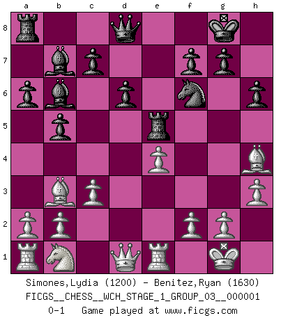 Last move : 0-1 2006 August 10 10:5:49 [Event "FICGS__CHESS__WCH_STAGE_1_GROUP_03__000001"] [Site "FICGS"] [Date "2006.07.01"] [Round "1"] [White "Simones,Lydia"] [Black "Benitez,Ryan"] [Result "0-1"] [WhiteElo "1200"] [BlackElo "1630"] 1.e4 e5 2.Nf3 Nc6 3.Bb5 a6 4.Ba4 Nf6 5.O-O b5 6.Bb3 Bc5 7.c3 d6 8.h3 O-O 9.d4 Bb6 10.Re1 Re8 11.Bg5 h6 12.Bh4 Bb7 13.dxe5 Nxe5 14.Nxe5 Rxe5 0-1 Ruy Lopez : 5.O-O Kingside Castling by player White (move 5) Kingside Castling by player Black (move 8) Player Black won this chess game. Follow this game move after move (download)No one ever won a game by resigning. (Unknown) Offensichtlich kennt Kasparow nichts anderes als Schach, und ich könnte 500 weitere Spieler dieser Sorte benennen. (Judith Polgar) El Ajedrez es una guerra en un tablero. El objetivo es aplastar la mente del oponente. (Bobby Fischer) Ce qui caractérise les parties de combat, c'est que si le défenseur a constamment de difficiles problèmes à résoudre, l'attaquant doit chercher sans relâche de nouvelles possibilités d'attaque. (Koblentz) Waiting for chance ? Play in casinos. (FICGS proverb)